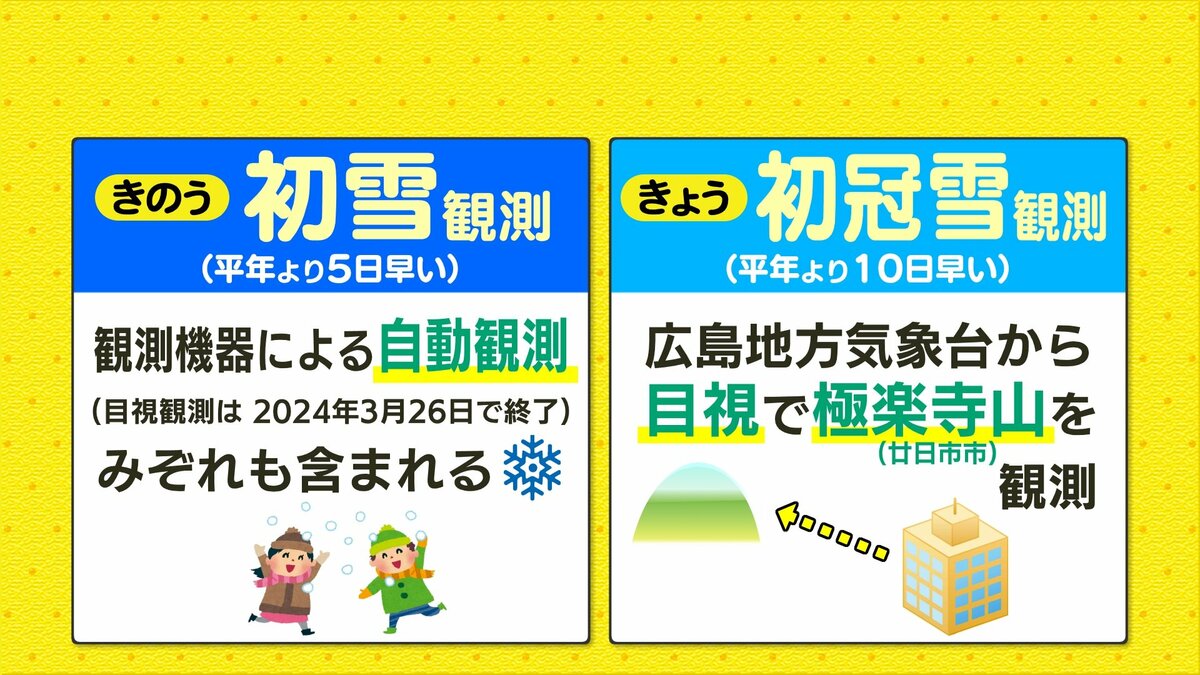 初冠雪は、広島地方気象台から目視で廿日市市の極楽寺山を観測しています。4日に観測し、平年より10日早い発表となっています。