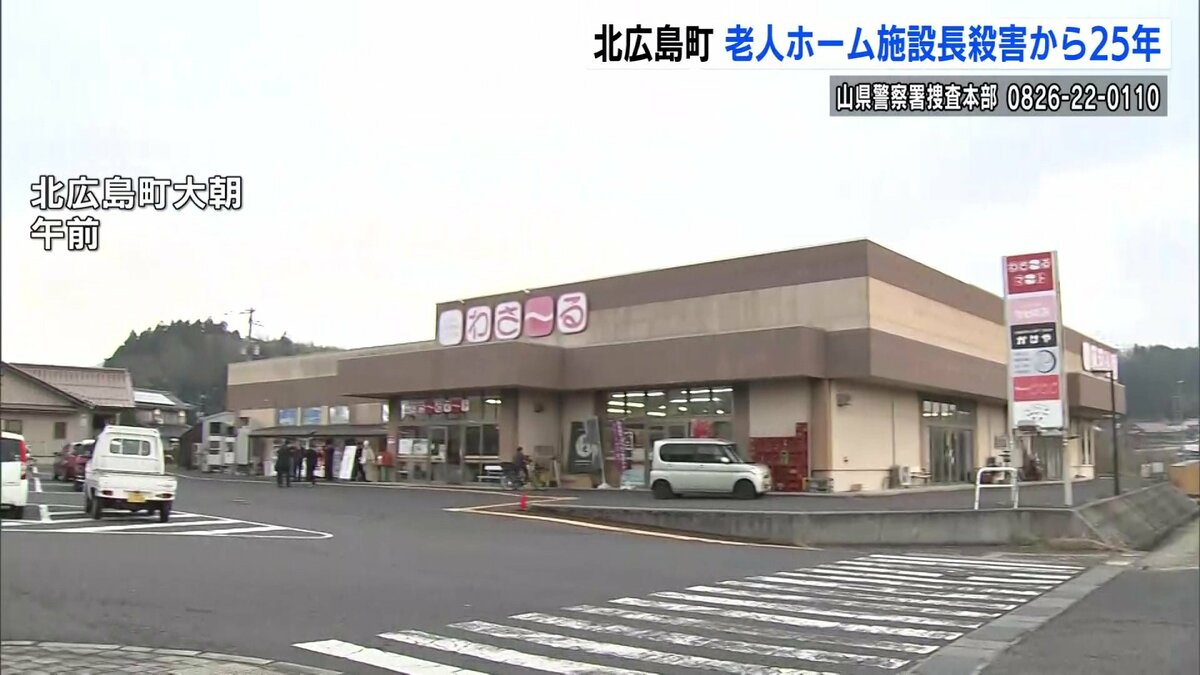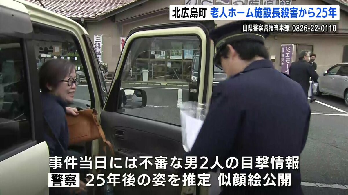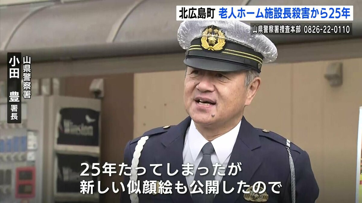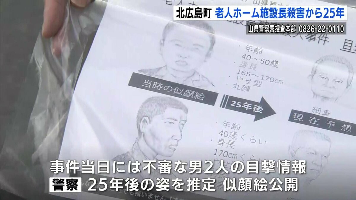 広島県北広島町で老人ホームの施設長が殺害された事件は、未解決のまま、発生から25年となりました。県警は不審な男の25年後を推定し、新たな似顔絵を公開すると共に、8日に現場付近で情報提供を呼びかけました。