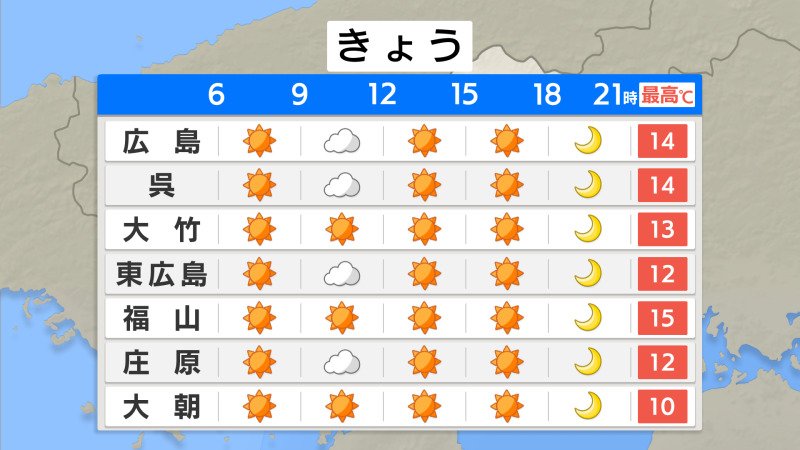 最低気温は、広島市中区3.6℃・庄原市-2.3℃・廿日市市津田-2.8℃・世羅町や神石高原町油木で‐3.9℃と、各地で強く冷え込みました。