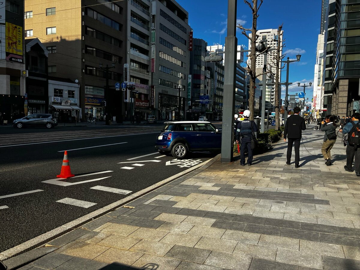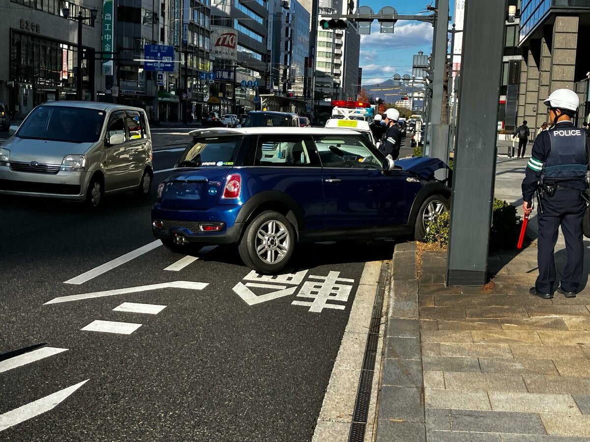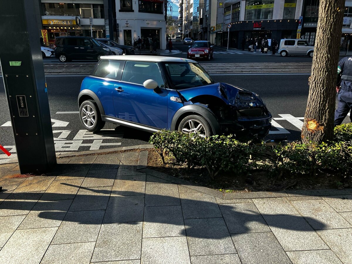 警察によりますと、9日午後0時半ごろ、広島市中区袋町の国道54号で、直進していた乗用車が、何らかの理由で路面電車の軌道を超えて、反対車線の街路樹に衝突したとみられています。