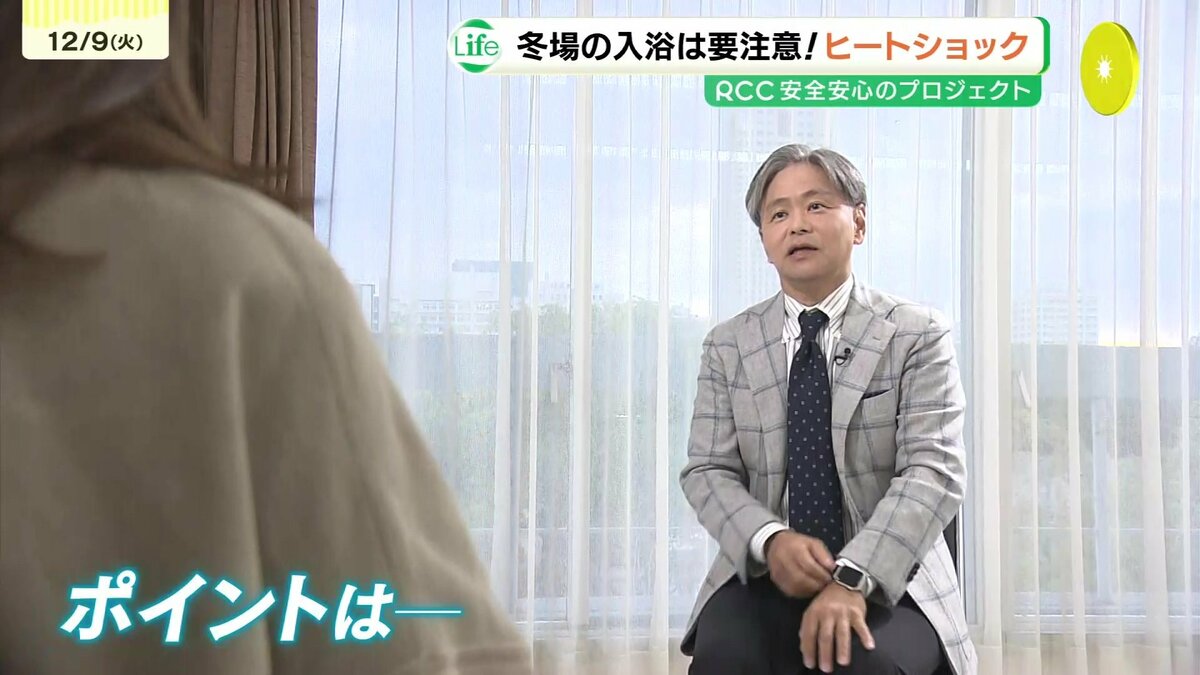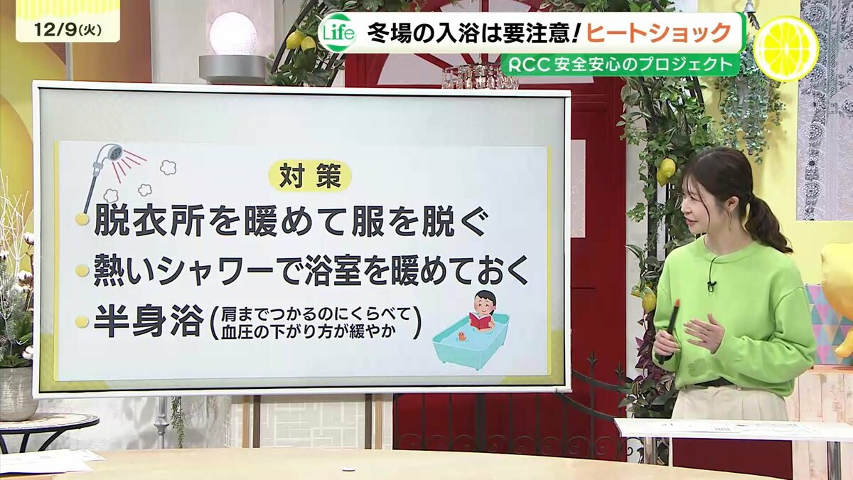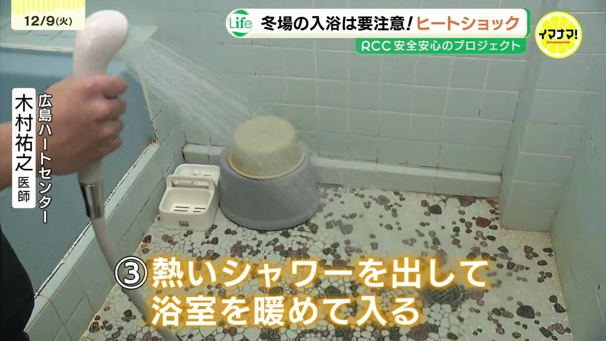 「①まず脱衣所を暖めてから服を脱ぐ②高齢の方は、できれば半身浴にするとか③水がもったいないですけど、熱いシャワーを出して浴室を暖めてから入るというのもいいアイディアだと思います」