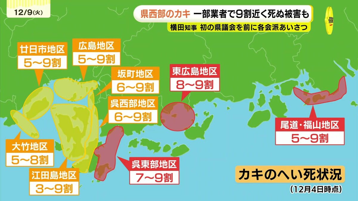 9日に開かれた農林水産委員会では、県が新たにまとめた県内全域の被害状況が説明されました。調査によりますと、被害が大きい県中東部に加え、県西部でも一部の養殖業者で9割近くのカキが死ぬ被害が報告されているということです。