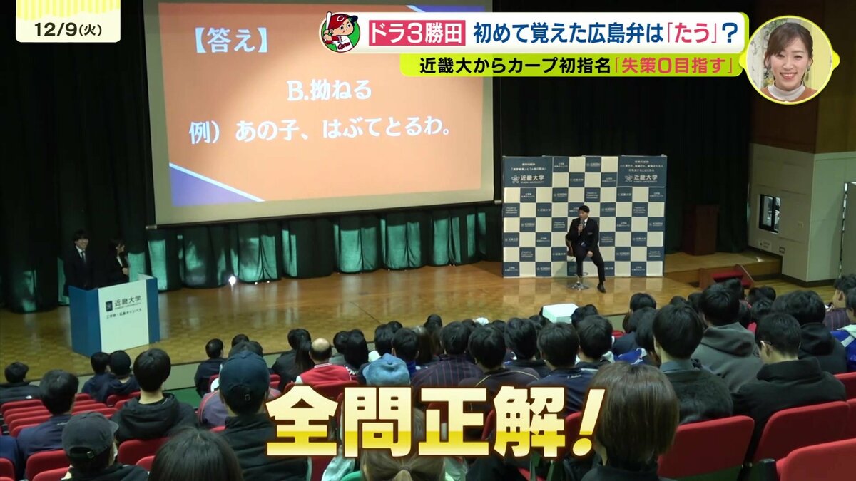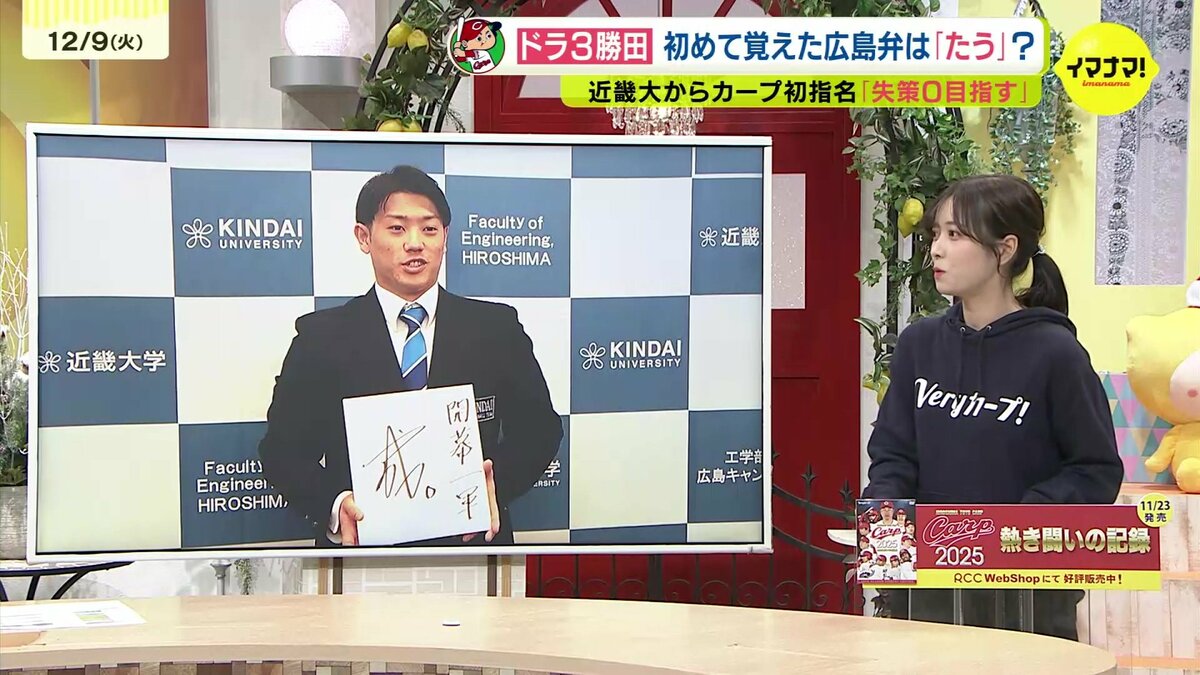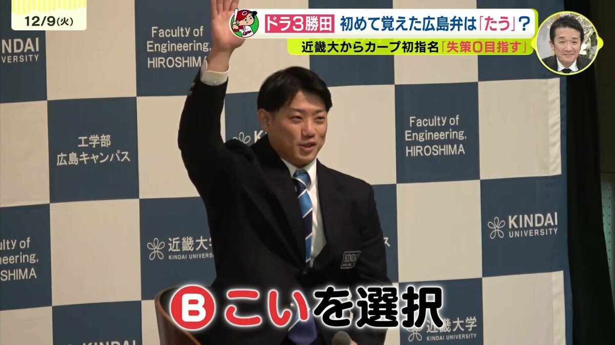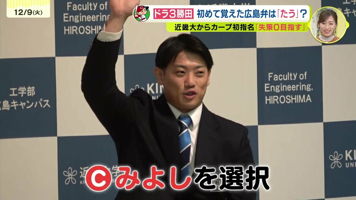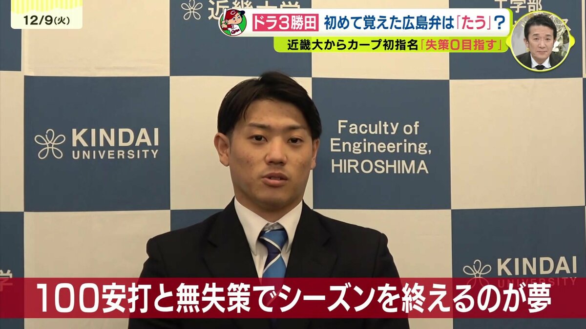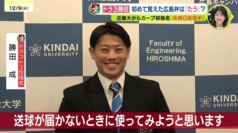 今秋のドラフト会議でカープにドラフト3位で指名された近畿大学の勝田成選手が初めて広島を訪れ、学生向けのイベントに出席しました。
