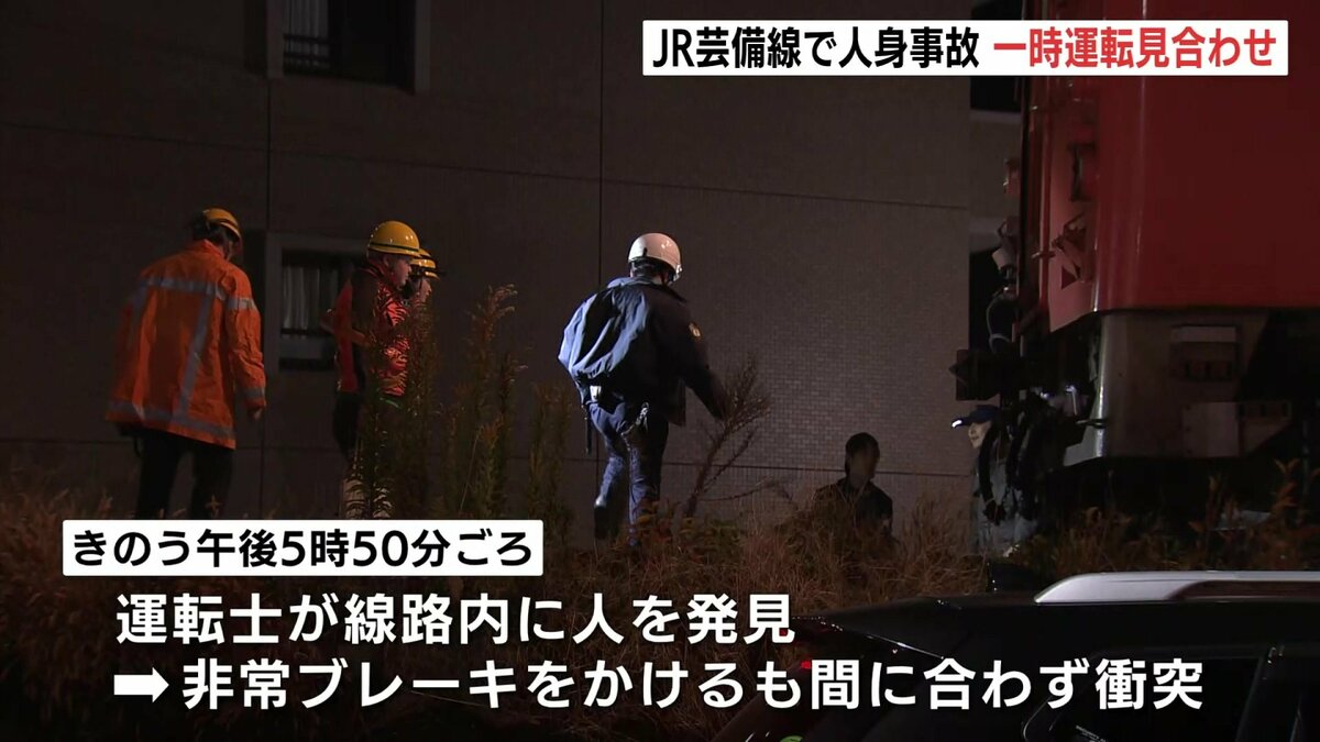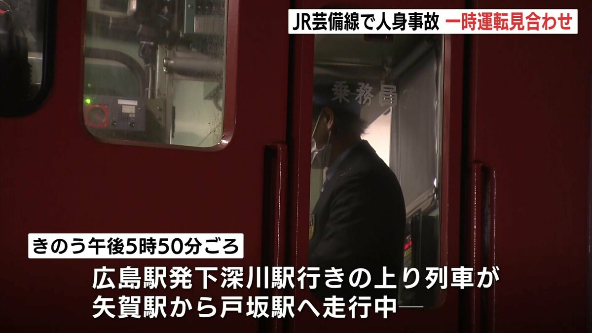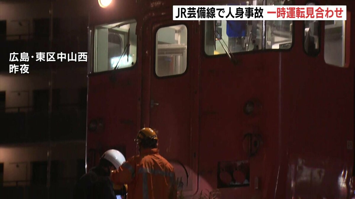 警察とJR西日本によりますと、9日午後5時50分ごろ、広島駅発下深川駅行きの上りの普通列車が、矢賀駅から戸坂駅に向かって走行していたところ、運転士が線路内に人がいるのを発見。非常ブレーキをかけましたが、間に合わず衝突したということです。