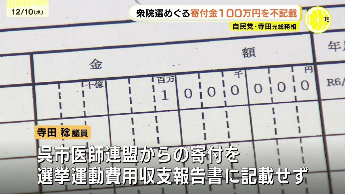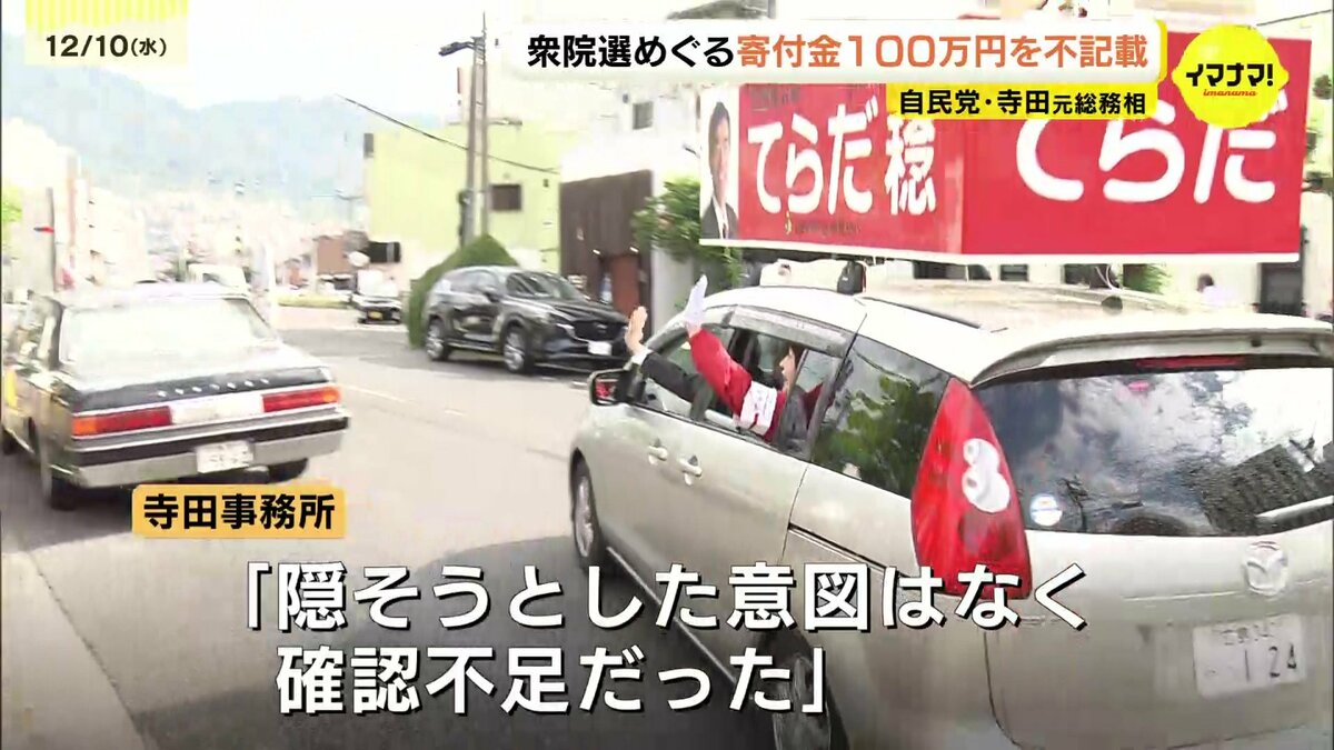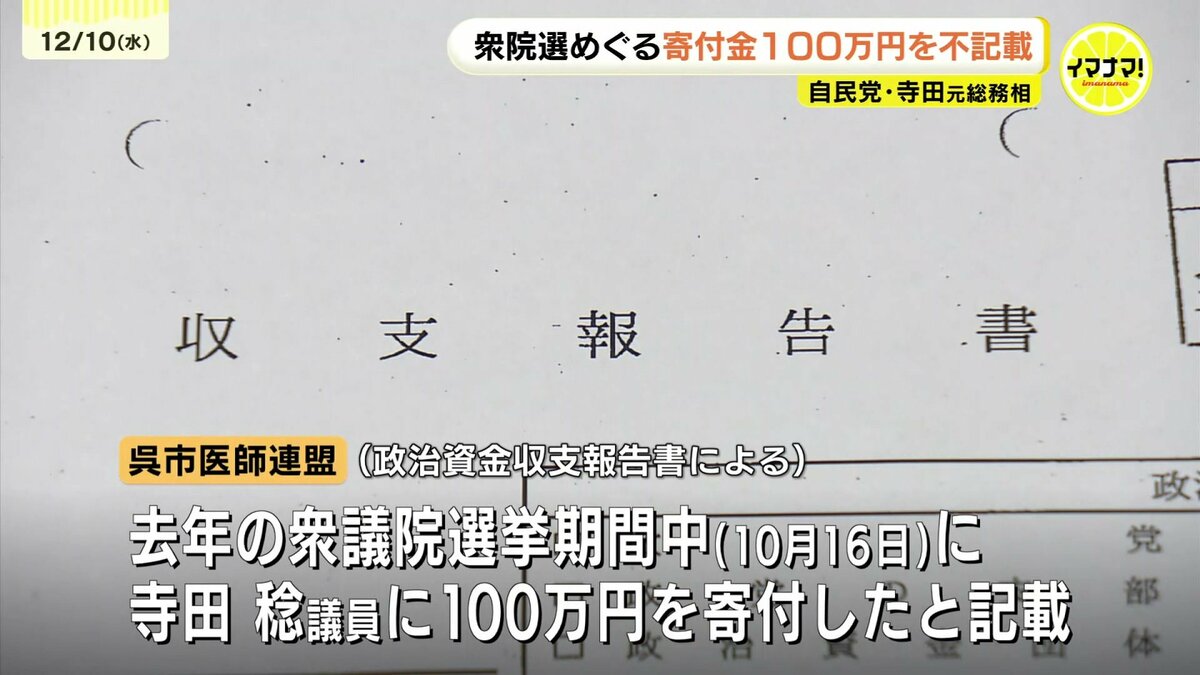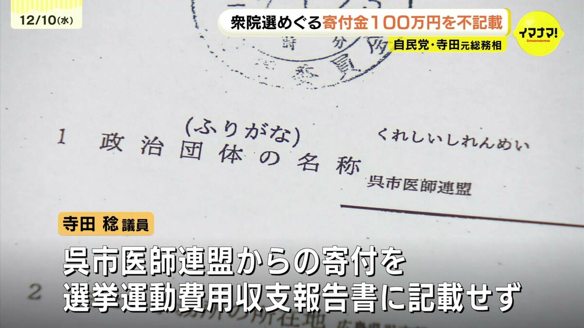 広島県の選挙管理委員会が公表した政治資金収支報告書によりますと、呉市医師連盟は去年の衆議院選挙期間中の10月16日に寺田議員に100万円寄付したと記載しています。しかし、寺田議員側は、これを選挙後に提出する選挙運動費用収支報告書に記載していませんでした。寺田議員の事務所は、「報告書作成時に、領収書の控えとの照らし合わせがきちんとできていなかった。隠そうとした意図はなく確認不足だった」と説明しています。訂正した報告書は9日選管に提出しています。