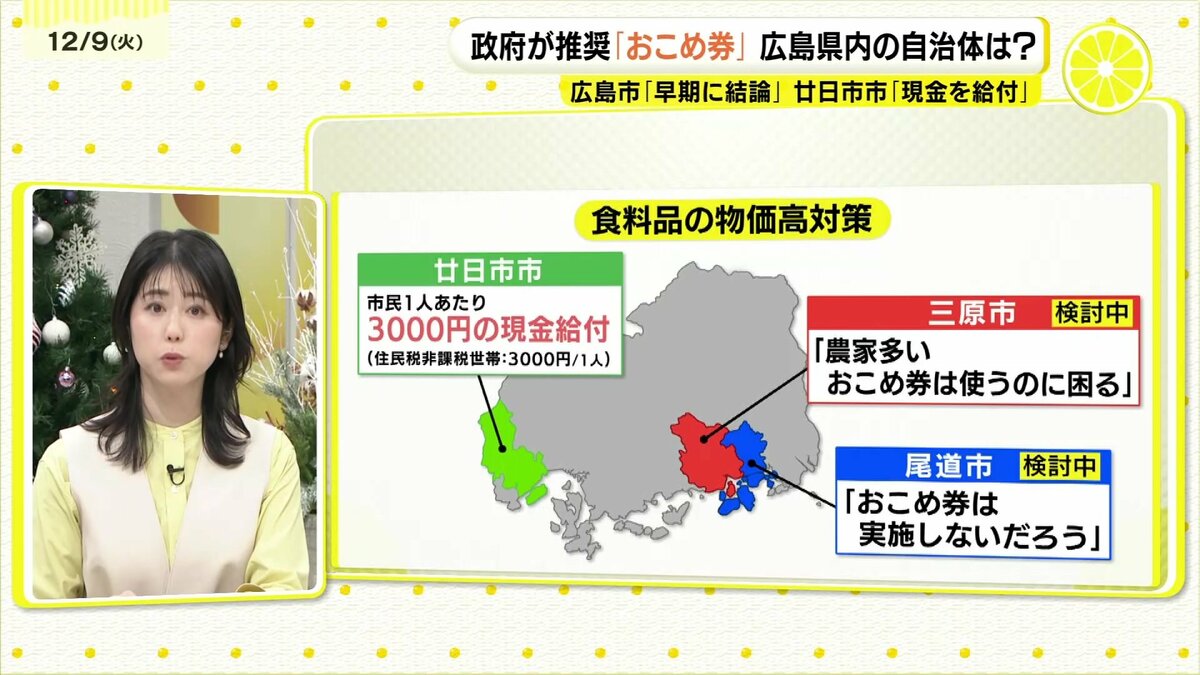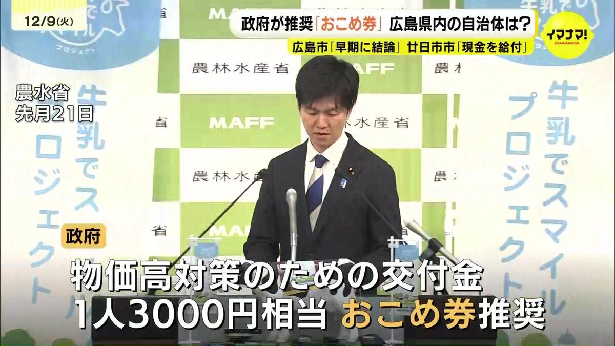 ▽廿日市市は9日、●おこめ券は配布せず●市民全員に1人あたり3000円の現金給付をすると発表しました。住民税非課税世帯は1人あたり3000円が追加となります。▽「検討中」の尾道市は●「おこめ券は配布しないだろう」とのこと。▽同じく「検討中」の三原市も●「市内に農家が多いのでおこめ券を配っても、使うのに困るのでは」とのことです。