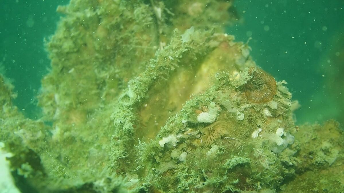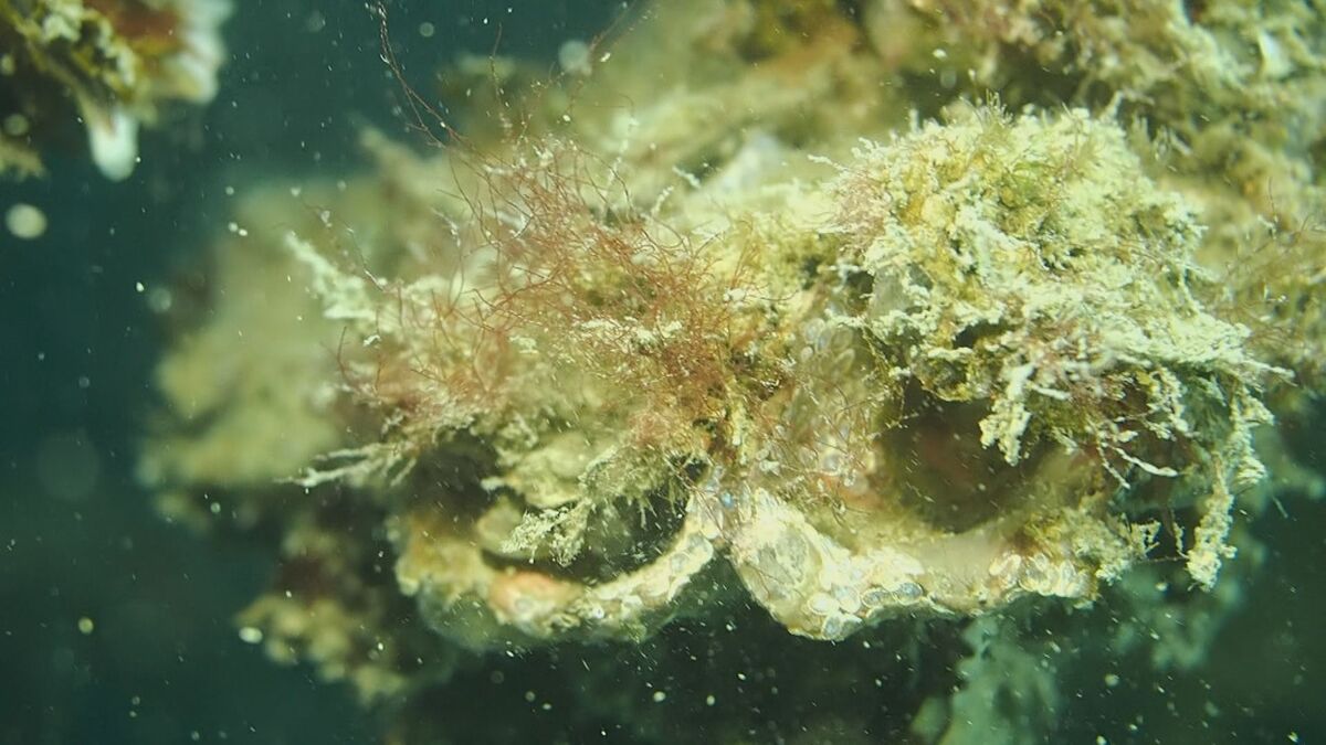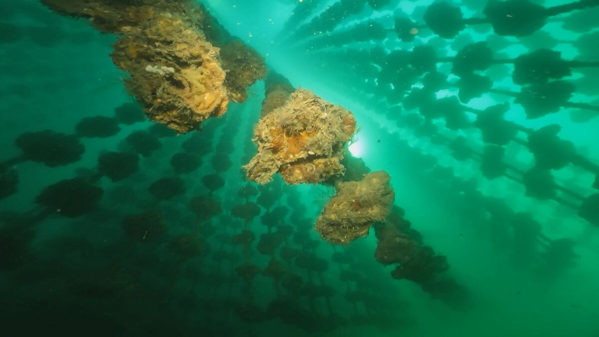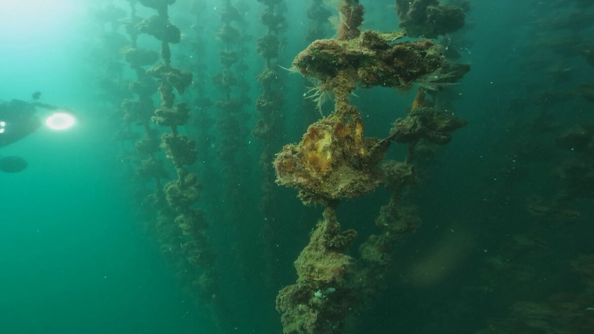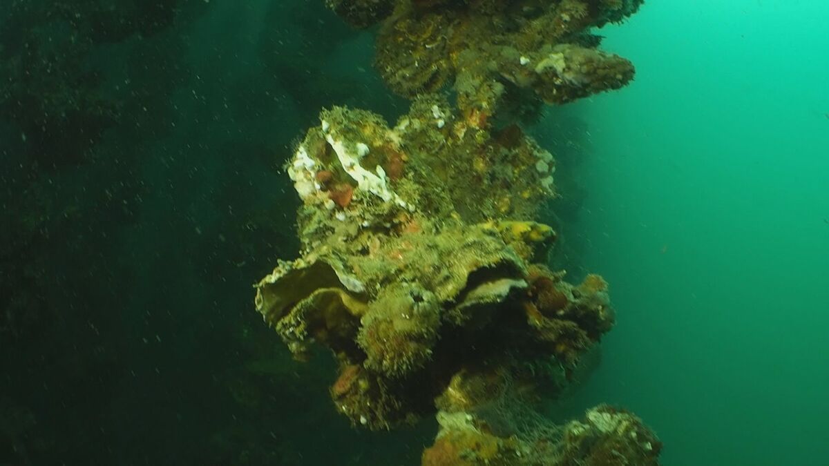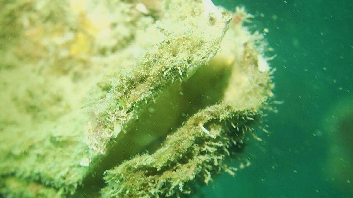 カキ筏で養殖されているカキの海の中の様子です。死んでしまい、口を開けて、中身は空っぽの状態です。今シーズン水揚げされるカキだけでなく、来シーズンのものでもこうした状態が見られます。カキ大量死の被害が集中する呉市で養殖業者のカキ筏を潜水取材しました。