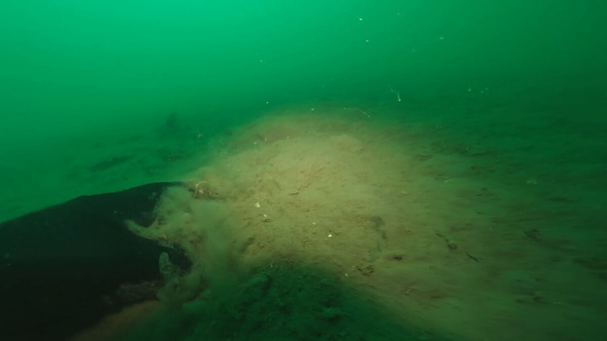 カキ筏の下はどのような状況になっているのでしょうか。今回、特別に許可を得て、RCCのカメラが海の中の様子を撮影しました。この日の海水温は、17・7度。この時期としては、例年に比べ、2度近く高い状態でした。水中でカメラがとらえたのは、いたるところで、口を開けたまま中身の無いカキが、筏からぶら下がっている様子でした。また、海底には、ヘドロのようなとても柔らかい泥が大量に堆積していて、手で巻き上げると視界が遮られるほどでした。
