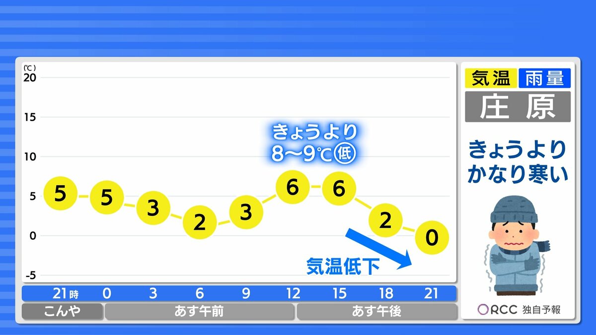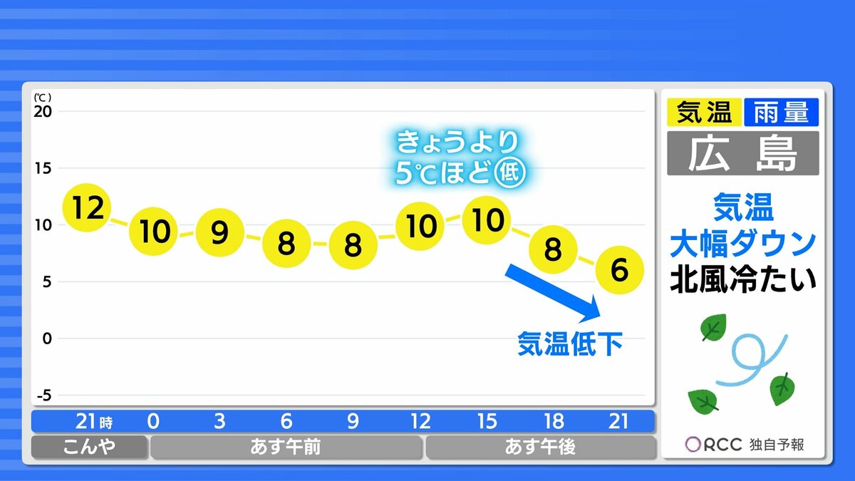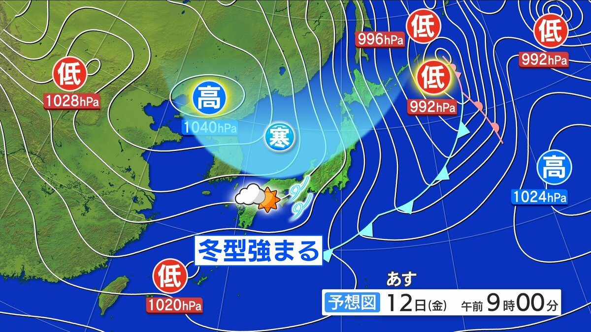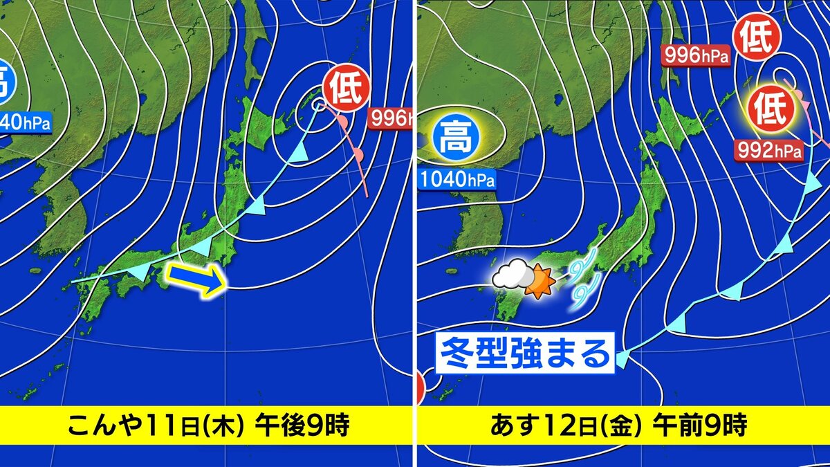 あすは等圧線の間隔が狭くなっていますが、北風が強く吹き、風冷えの一日となります。朝よりも夜の方が寒くなる見込みで、日中の気温は、きょうよりも5℃前後低くなり、北部では8℃~9℃ほど低くなるところもあるでしょう。防寒対策は万全にしてお過ごしください。