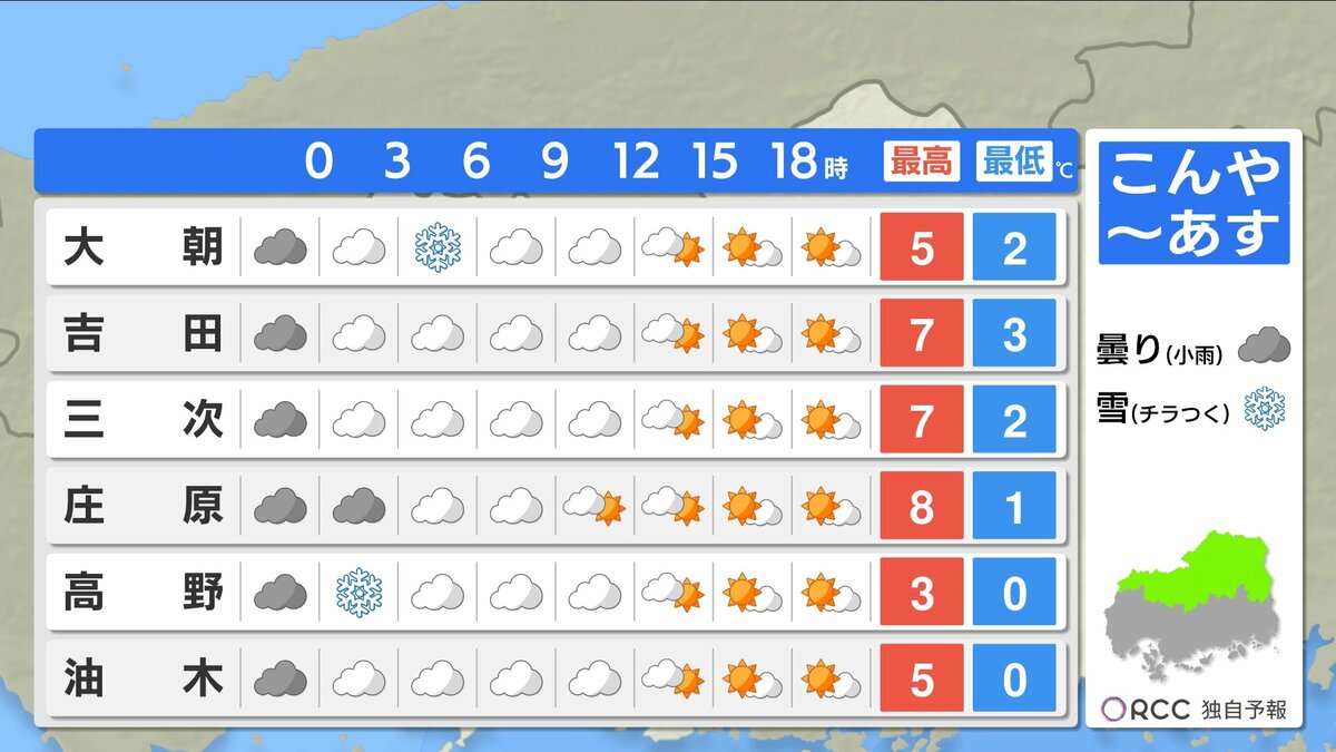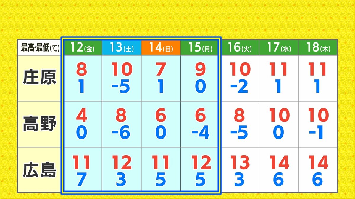 週末は再び天気が崩れ、土曜日の午後から日曜日の朝にかけて雨や雪が降る見込みです。気温も低く、かなり寒く感じられるでしょう。特に土曜日朝の冷え込みはかなり強まりますのでご注意ください。