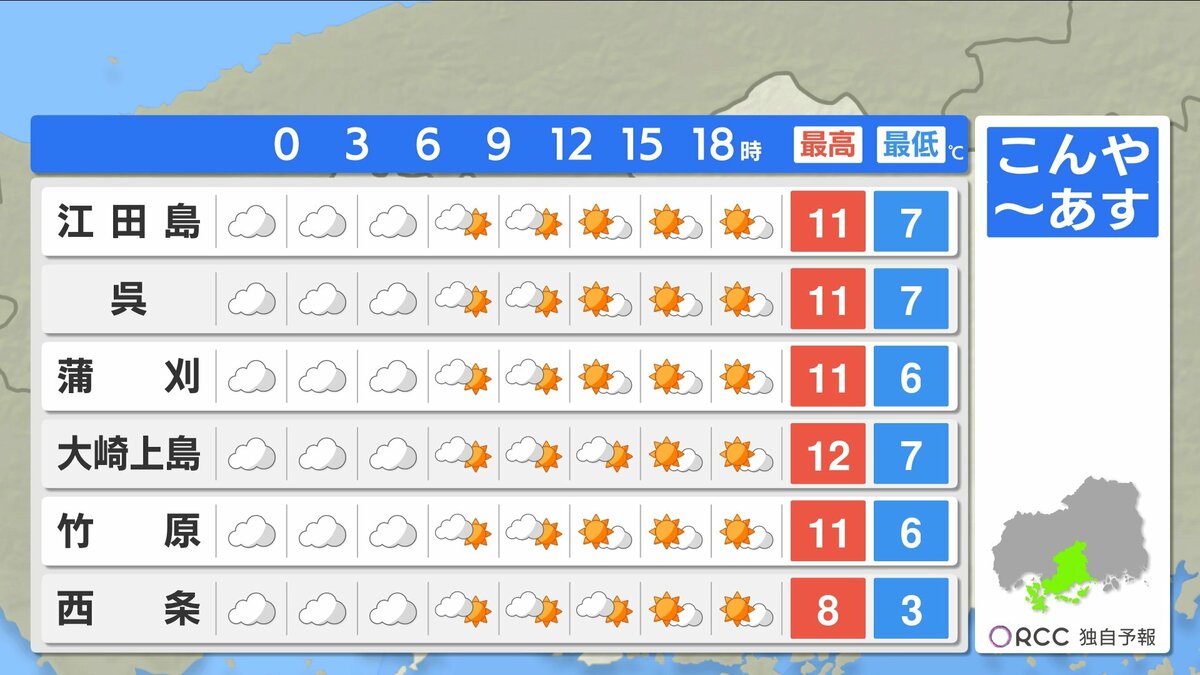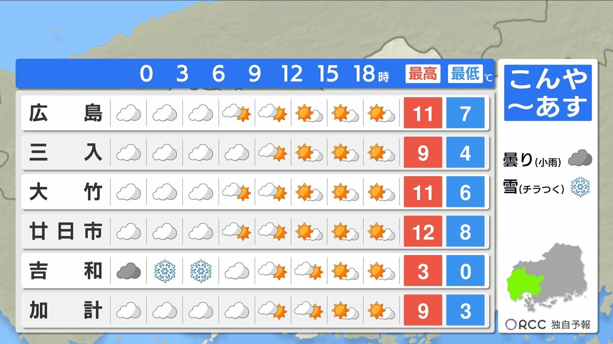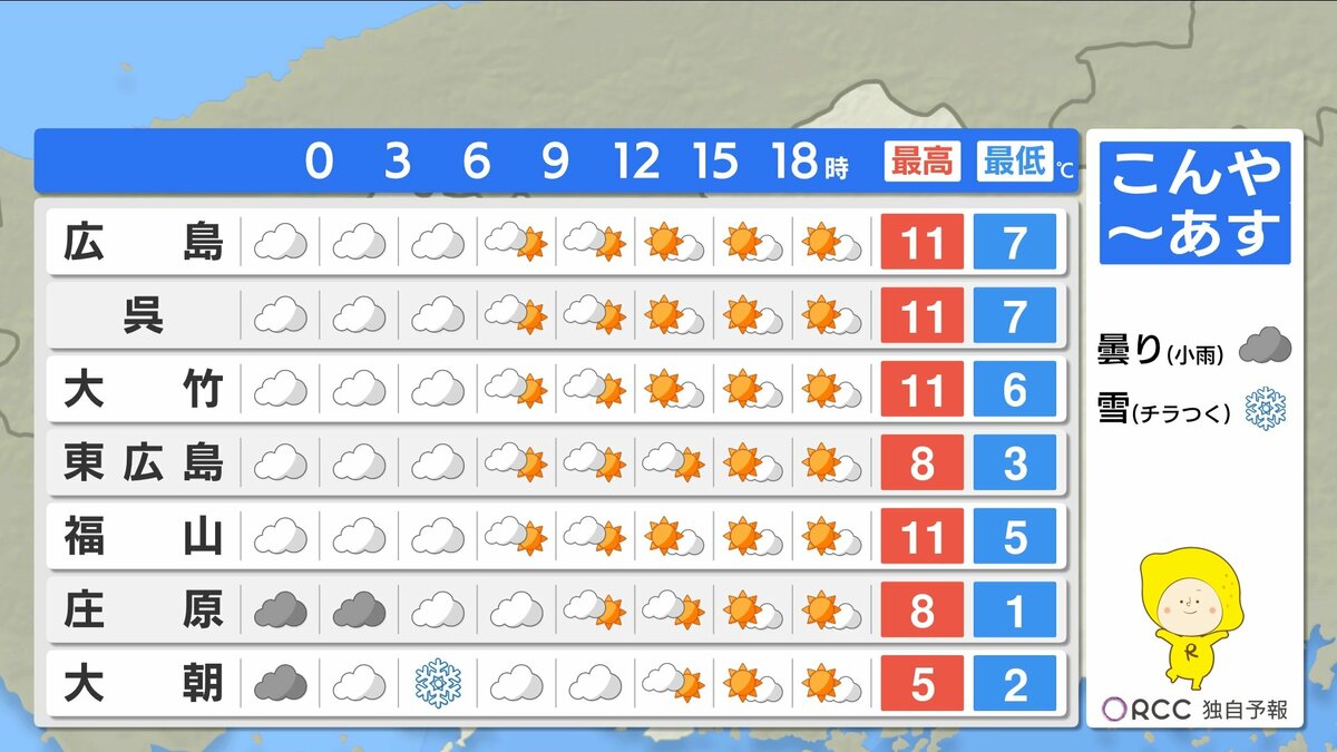 きょう12日(金)の広島県内は、朝は晴れていましたが、午後は各地で不安定な空模様になりました。最高気温は、16℃を超えた地点もあり、広島市中区では15.2℃まで上がりました。