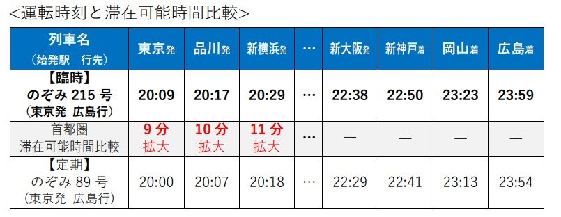 一方下りも、東京駅を午後8時9分に出て、広島駅に午後11時59分に着く臨時列車「のぞみ215号」を新設します。
