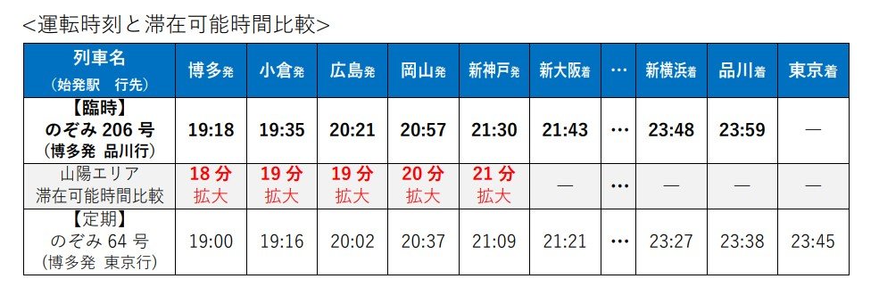 上りは、博多駅を午後7時18分、広島駅を午後8時21分に出発し、品川駅に午後11時59分に着く臨時列車「のぞみ206号」を新設します。