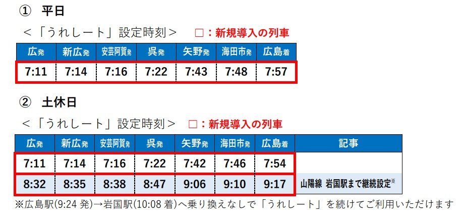JR西日本によりますと、有料座席サービス「うれシート」が設定されるのは、JR呉線の広駅を午前7時11分、呉駅を午前7時22分に出発する広島駅行きの列車です。加えて土休日には、広駅を午前8時32分に出発する岩国駅行きにも設定します。