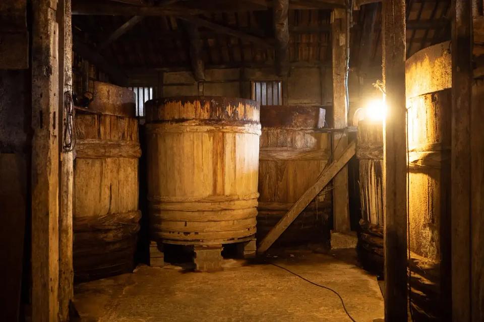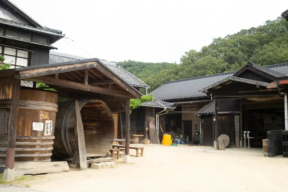 ヤマロク醤油は、カルチバから車で約10分ほどの安田地区にあり、年中無休で蔵見学ができる、小豆島にある醤油蔵の中でも唯一のスポット。すべて木桶仕込みで醤油造りが行われており、100年以上前に建てられた蔵内に、乳酸菌や酵母菌などが付着した木桶が建ち並ぶさまは圧巻。
