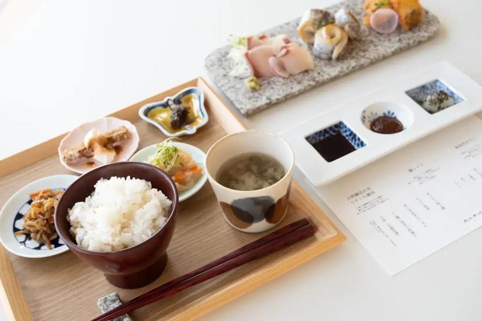 店内で水耕栽培するマイクロリーフや、生のり佃煮、小豆島安田産のご飯、ふし麺と海苔の味噌汁、食後の甘味(お醤油棒という鶴醤が効いたキャラメル風味の硬めのクッキー)まで、島の恵みを存分に堪能できます。