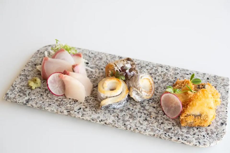 魚は日によって変わるようですが、取材当日は刺身がオリーブはまち、炙りがタチウオ、フライがサゴシでした。タレは3種類。小豆島の正金醤油のうすくち醤油は淡白な白身魚によく合います。醤トマトソースは自社製。ヤマロク醤油の鶴醤とスパイスを煮込んで作っており、フライに合うソースでした。小豆島産オリーブオイルを忍ばせた塩昆布入り大根おろしは意外な組み合わせに驚き!