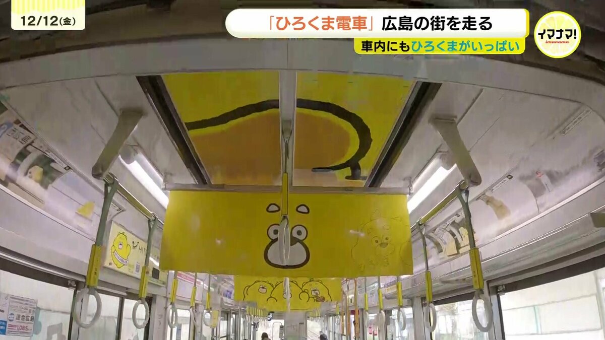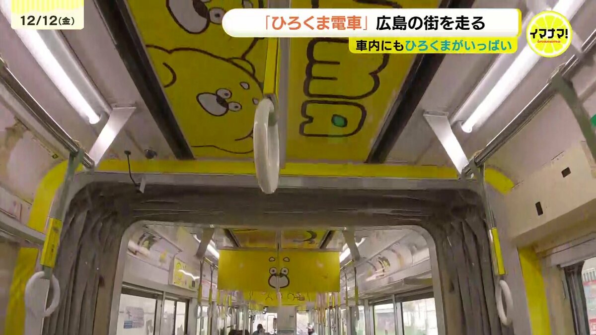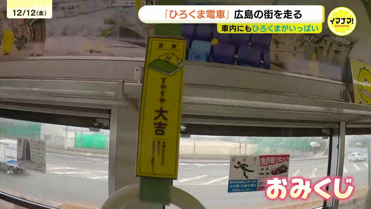 車内にもいたるところに、ひろくまの姿が…。つり革には、ひろくまのおみくじがついていて、運勢を占うことができます。また、車内にはひろくまが県内各地を旅した様子を撮影したポスターも展示されています。今回、乗車したのはHITひろしま観光大使およそ20人です。