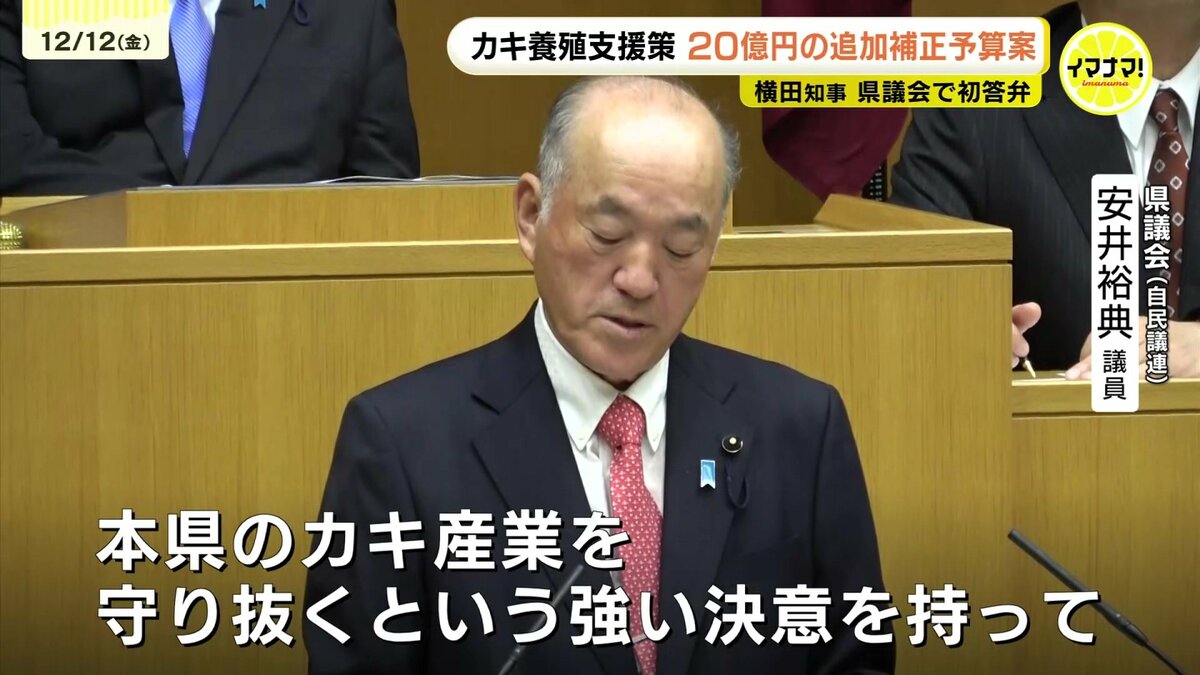 広島県議会は12日、一般質問の初日を迎え、横田知事が就任後初の本会議答弁に臨みました。県はカキ養殖への支援策として20億円の補正予算案を追加提案しました。