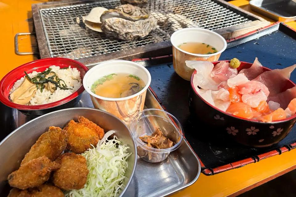 牡蠣をとことん楽しみたい方は、「焼き牡蠣食べ放題」を網焼きで!他のメニューも堪能したい方には、カキフライに牡蠣飯、牡蠣のすまし汁がついた「かき尽くし定食」がおすすめ!市場の新鮮な魚介で作る海鮮丼もボリューム満点。