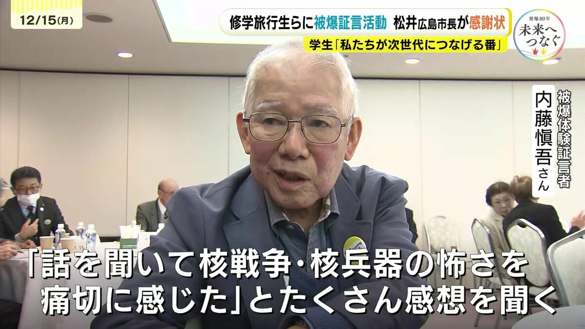 会場では、被爆証言を聞いた学生たちから寄せられた「私たちが、次世代につなげる番だと思った」といった感想も紹介されました。