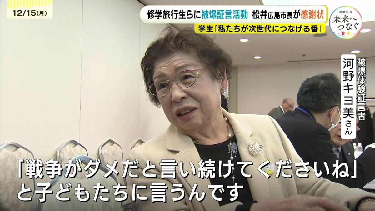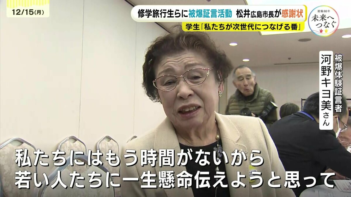 「私たちにはもう時間が無い。時間が無いから、若い人たちに一生懸命伝えようと思っています。『戦争がダメだというのを、言い続けてくださいね』と子どもたちに言うんです」