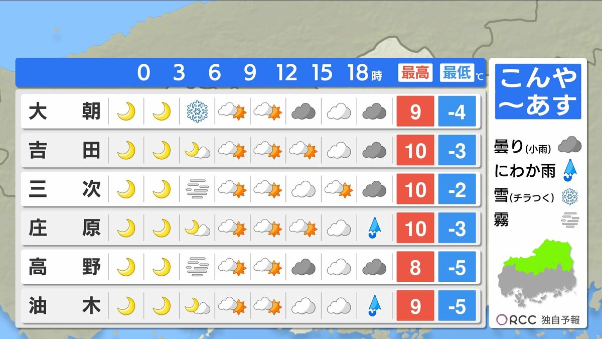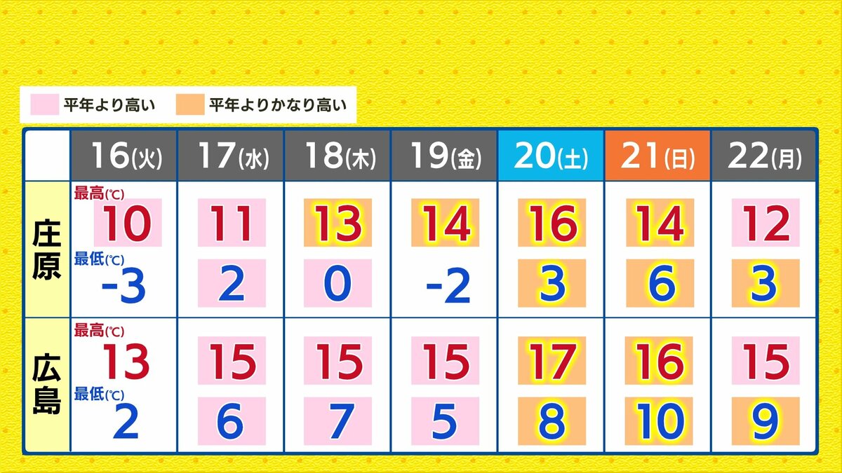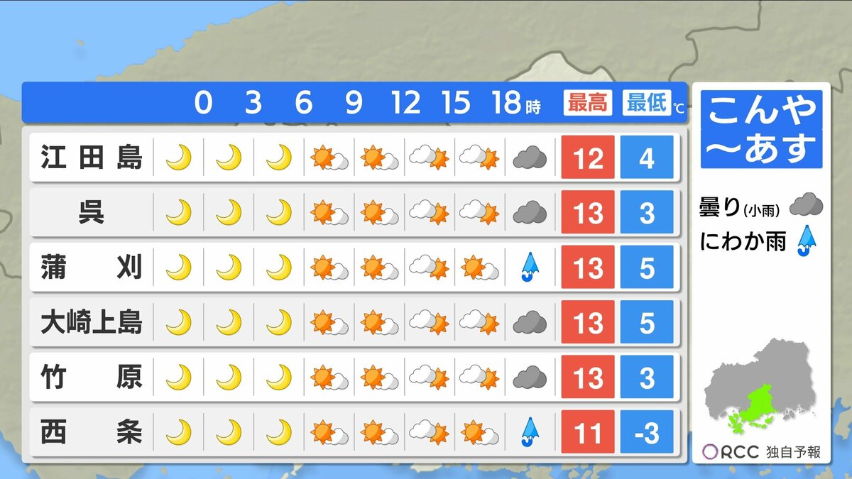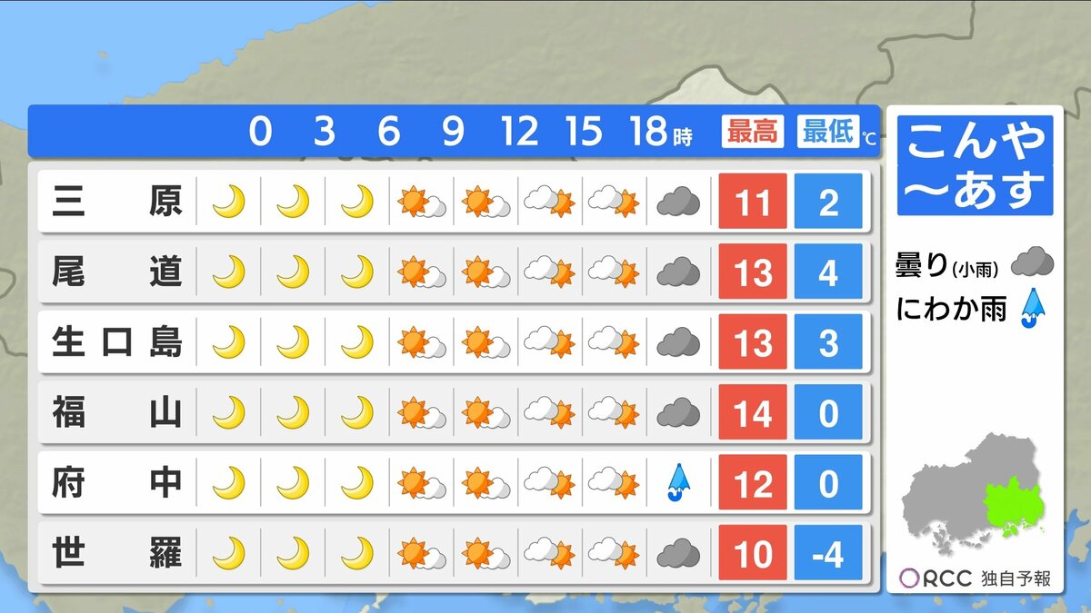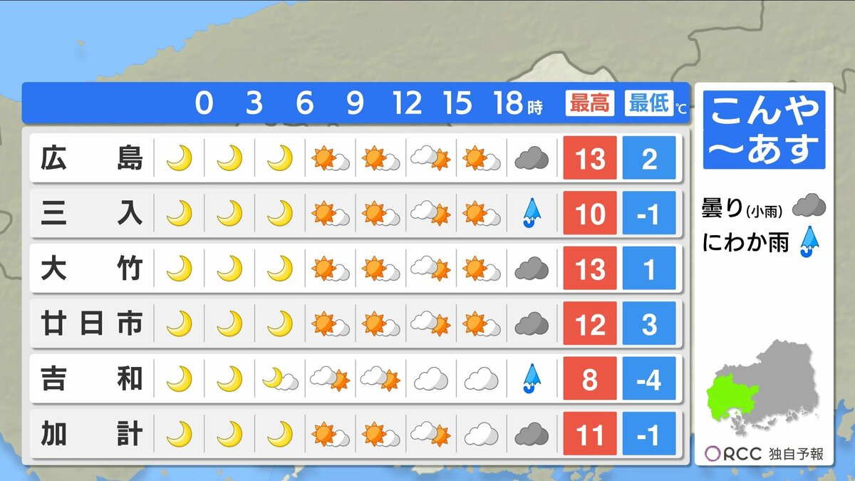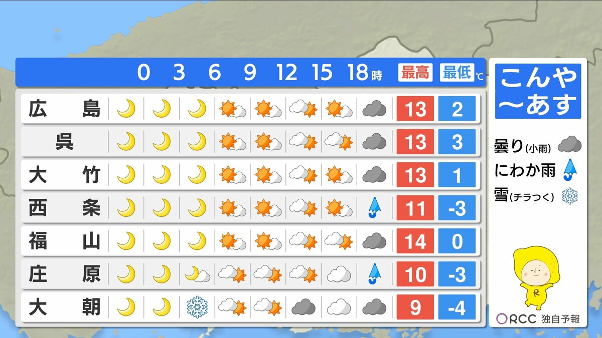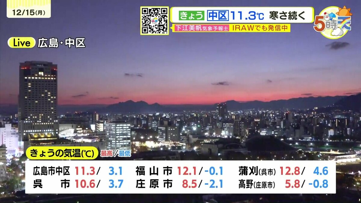 きょう15日(月)の広島県内は、午前中から寒気の影響で雲が広がりやすく、雨や雪が降った地点もありました。最高気温は、広島市中区で11.3℃ 大竹11.7℃など、この時期らしい寒さとなりました。