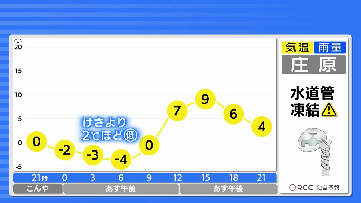 冬型の気圧配置が緩んだ直後で、あす朝の冷え込みはかなり厳しくなります。北部や内陸部では氷点下4℃~5℃まで冷え込む地点もある見込みです。水道管の凍結にご注意ください。