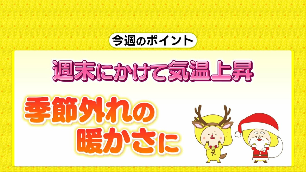 今週は雲が広がりやすい日が多く、水曜日は雨が降る見込みです。日中の気温は、週末にかけて上昇し、特に週末の気温は平年よりかなり高く、季節外れの暖かさになるでしょう。1週間のうちに気温変化がかなり大きいですので、体調管理にはくれぐれもご注意ください。