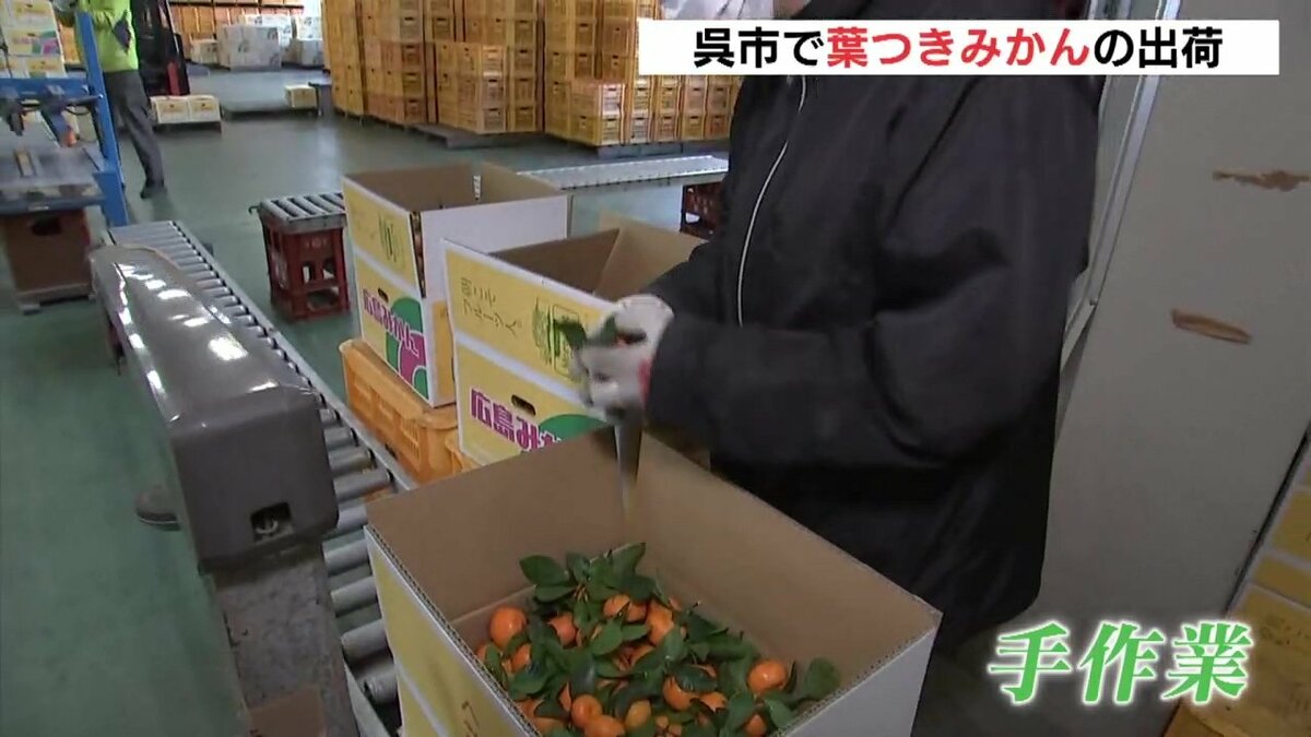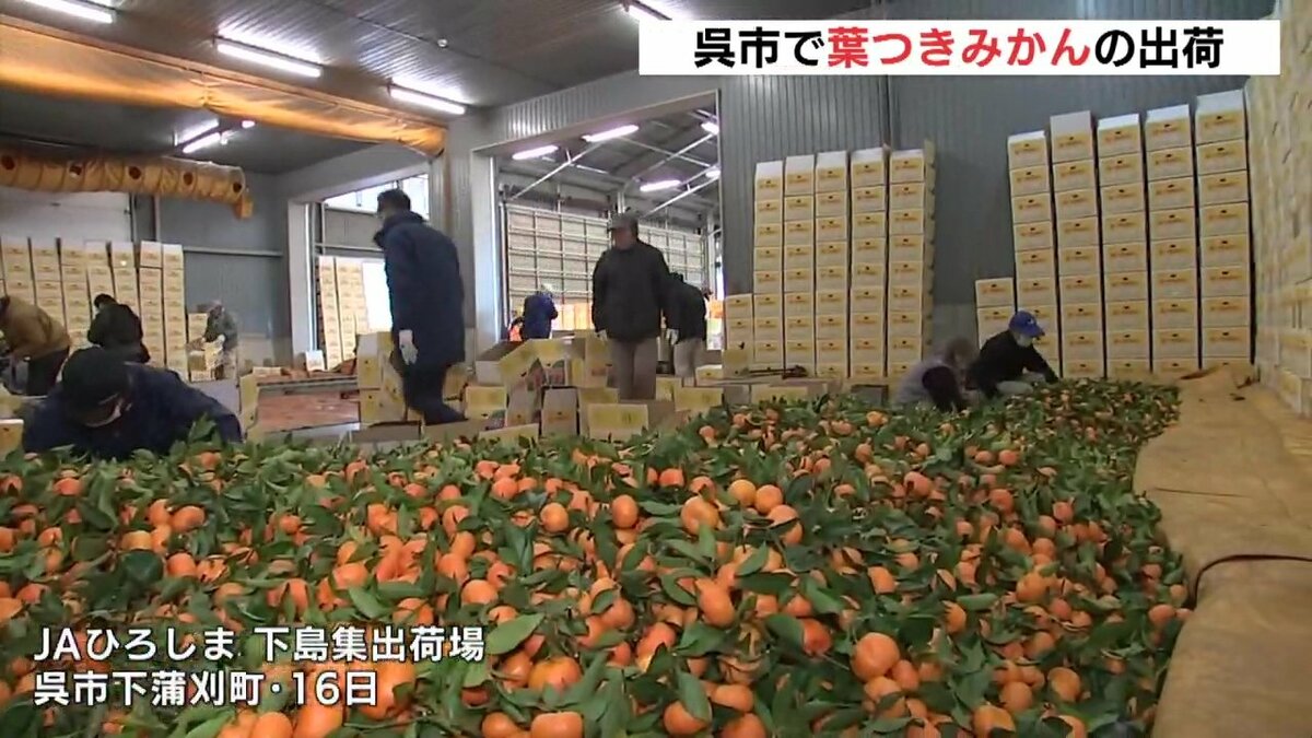 選果場には、収穫された葉つきミカンが山のように積み上げられました。広島県呉市下蒲刈地区は、「葉つきみかん」の県内最大の産地です。1537年にこの地区に伝わり現在、約150戸の農家が形や味を変えずに生産しています。葉を3、4枚残して出荷する「葉つきミカン」は、機械で選別や箱詰めができないためすべて、手作業で行います。ことしは、猛暑の影響が心配されましたが適度に雨が降ったため玉太りがよく仕上がりました。強い甘みと爽やかな香りが特徴で、食べても美味しいということです。