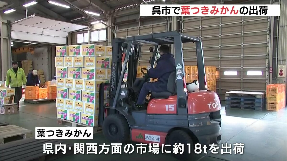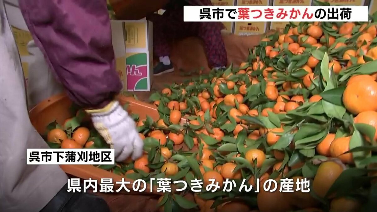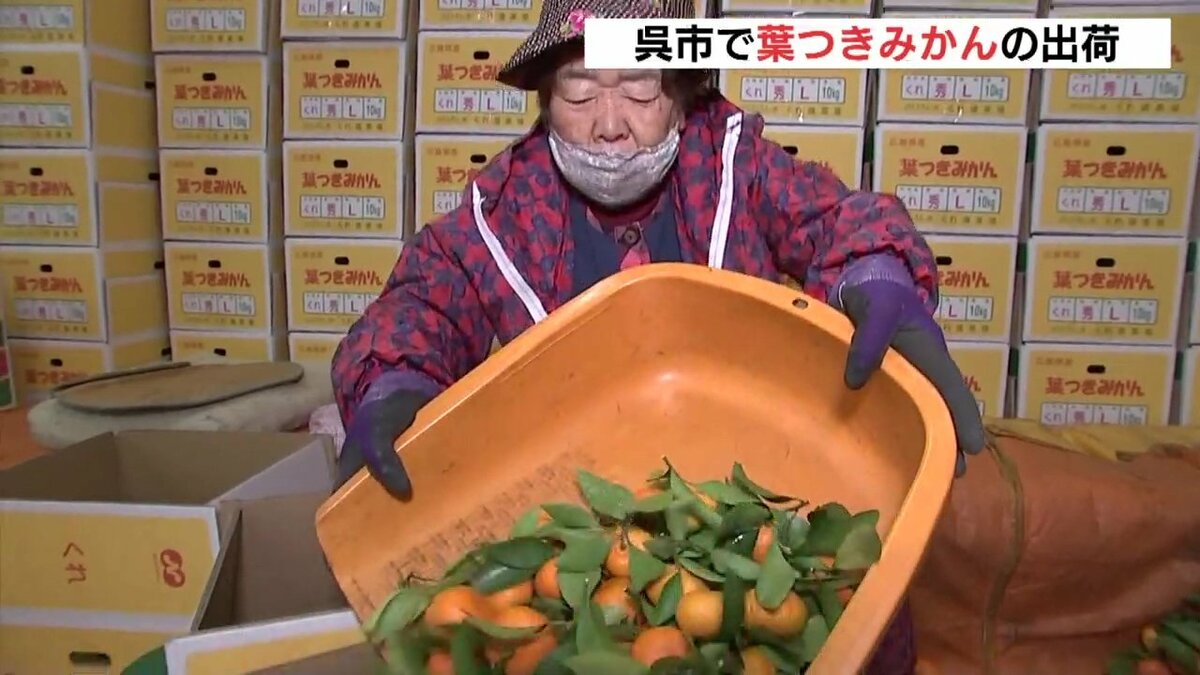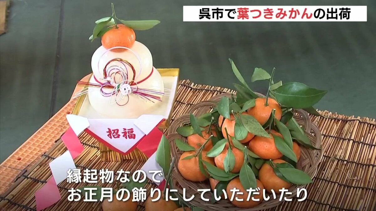 広島県呉市の島で正月の鏡もちやしめ飾りに彩りを添える「葉つきみかん」の出荷がありました。