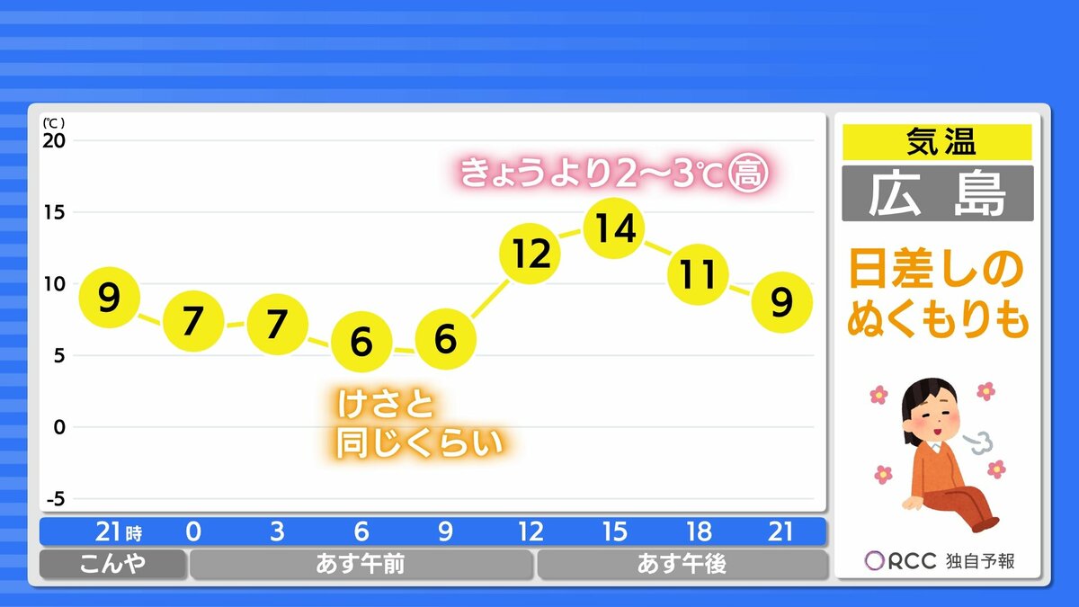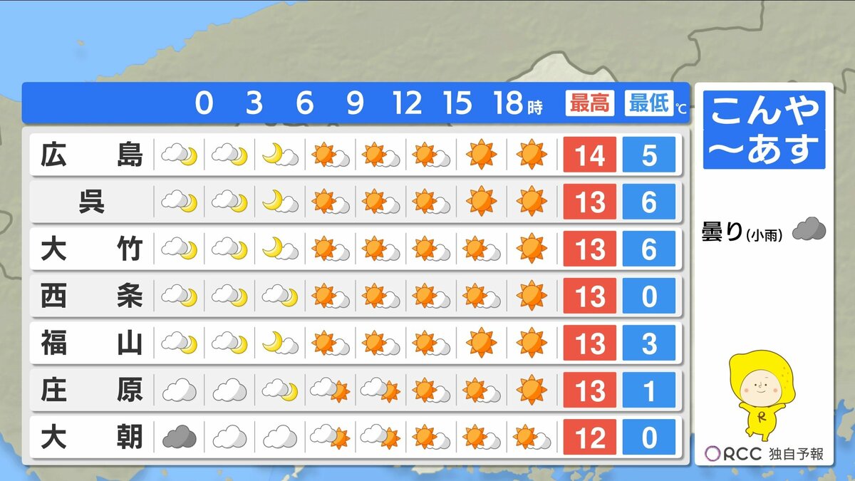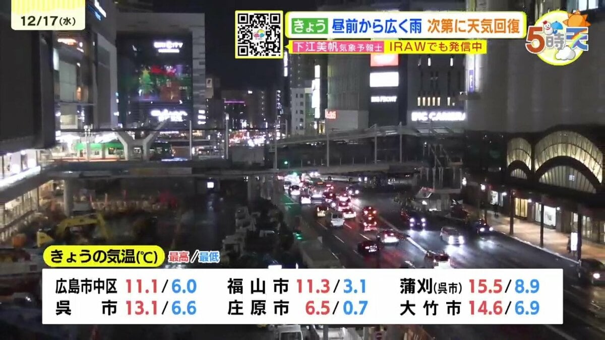 きょう17日(水)の広島県内は、午前中から広く一時的に雨が降りました。最高気温は、蒲刈で15.5℃ 大竹14.6℃など気温が上昇した地点もありましたが、広島市中区では11.1℃までしか上がらず、地点によって気温差が大きくなりました。