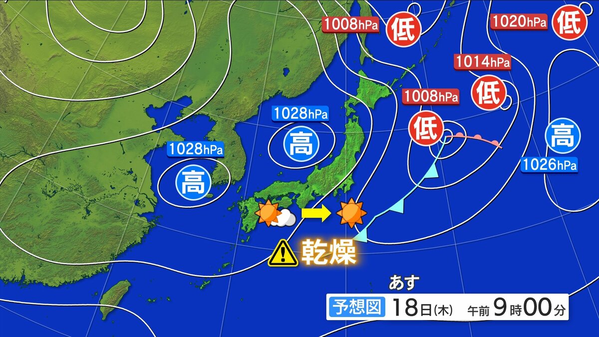 あすは高気圧に覆われ冬晴れの空が広がるでしょう。午前中は寒気の影響が残り、北部を中心に雲が広がりやすく雨の残る所がある見込みです。空気の乾燥が進みますので、火の取り扱いにはご注意ください。