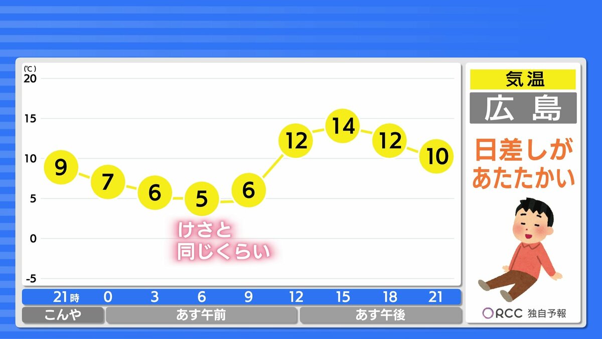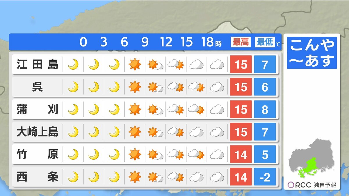 きょう18日(木)の広島県内は、朝からよく晴れて穏やかな冬晴れとなりました。最高気温は、広島市中区で14.6℃ 加計で15.3℃まで上がり、日差しが暖かい一日でした。