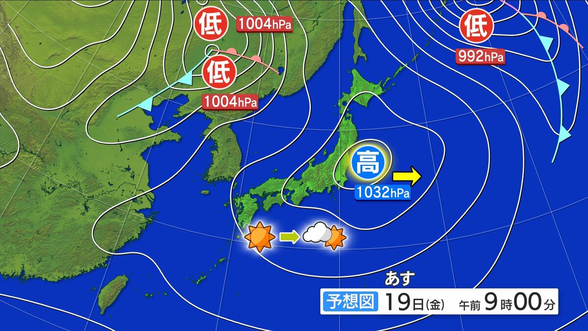 引き続き高気圧に覆われ、午前中ほどよく晴れるでしょう。高気圧の中心はだんだんと東に移動するため、午後は徐々に雲が多くなる見込みです。洗濯物を干す方は朝早くから干した方が良いでしょう。