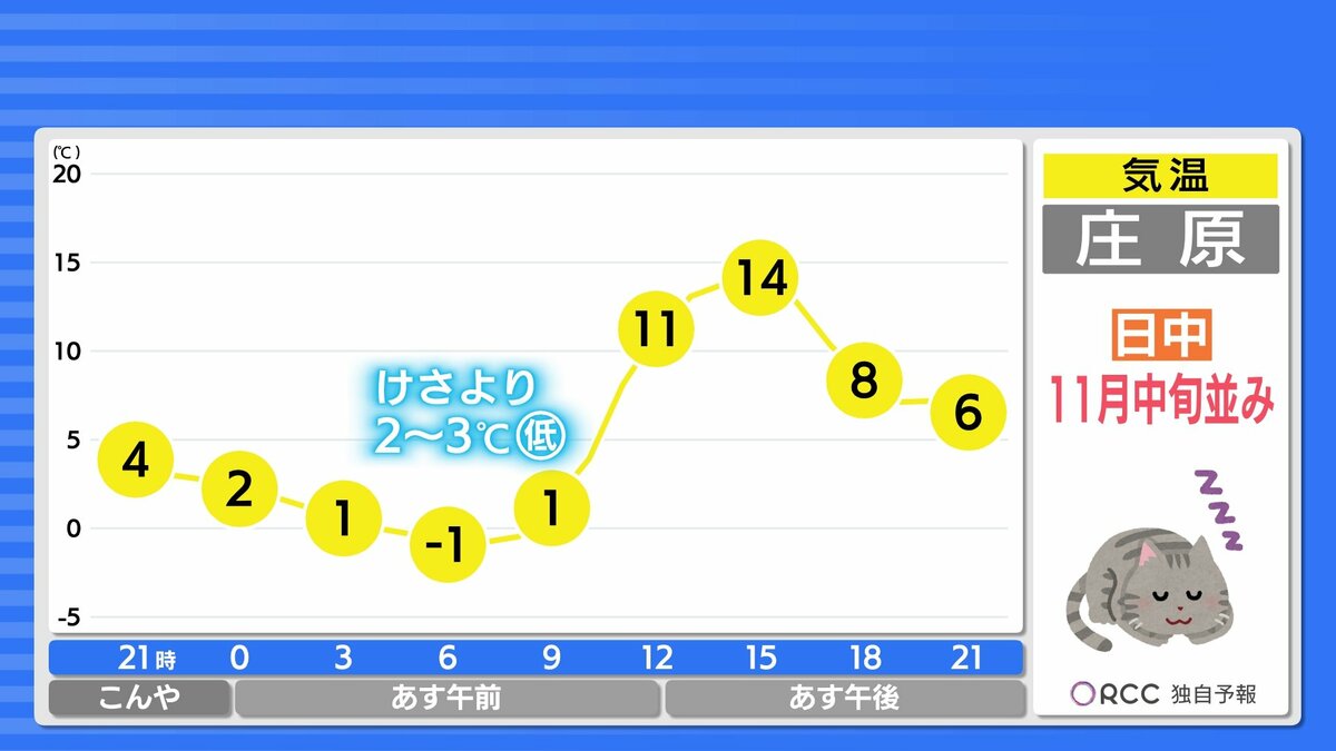 あすの予想最高気温は、各地で12℃~15℃くらいの地点が多く、11月並の気温になる見込みです。日なたでは暖かさを感じられるでしょう。北部や内陸部を中心に一日の寒暖差が大きくなるため、体調管理にはご注意ください。