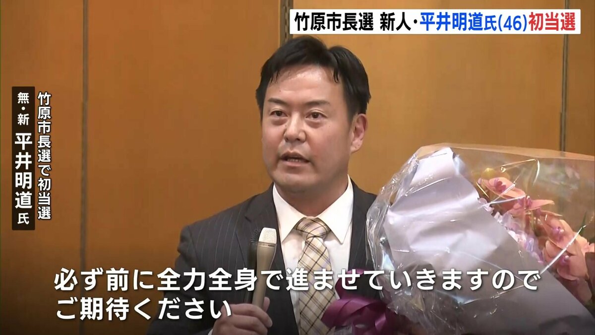 平井氏は、元竹原市議会議員で46歳。3回目の当選を目指した現職の今栄敏彦氏との一騎打ちを制して、初当選を果たしました。平井氏は「衰退してきた竹原市を先頭に立って改革していく」と述べました。
