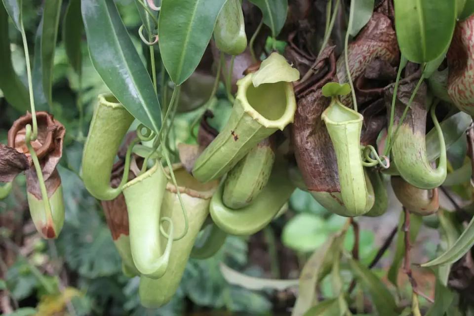 こちらは食虫植物のウツボカズラ。甘い香りで虫をおびき寄せて袋の中に落とし、消化液で溶かして栄養吸収するという特性がある植物です。