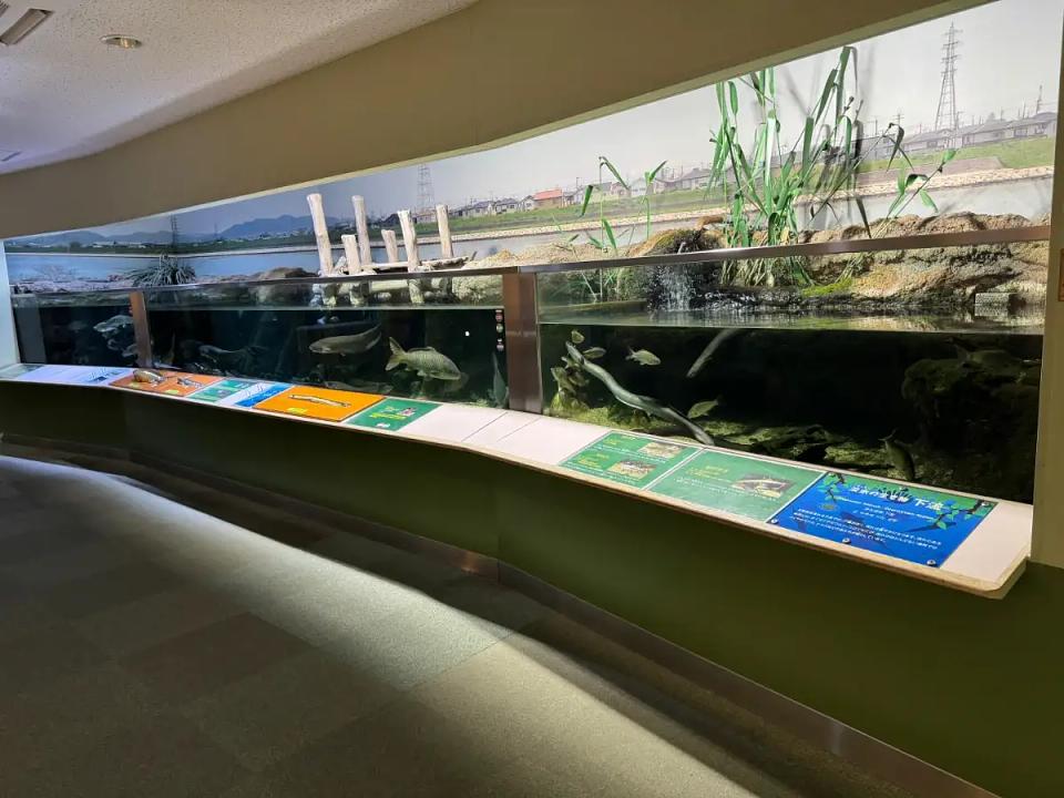 水族館への入館は新館1階から。新館では、播磨地方の田んぼやため池に住む身近な淡水魚や、播磨地方に生息する天然記念物オオサンショウウオといった貴重な生きものなどを中心に展示しています。