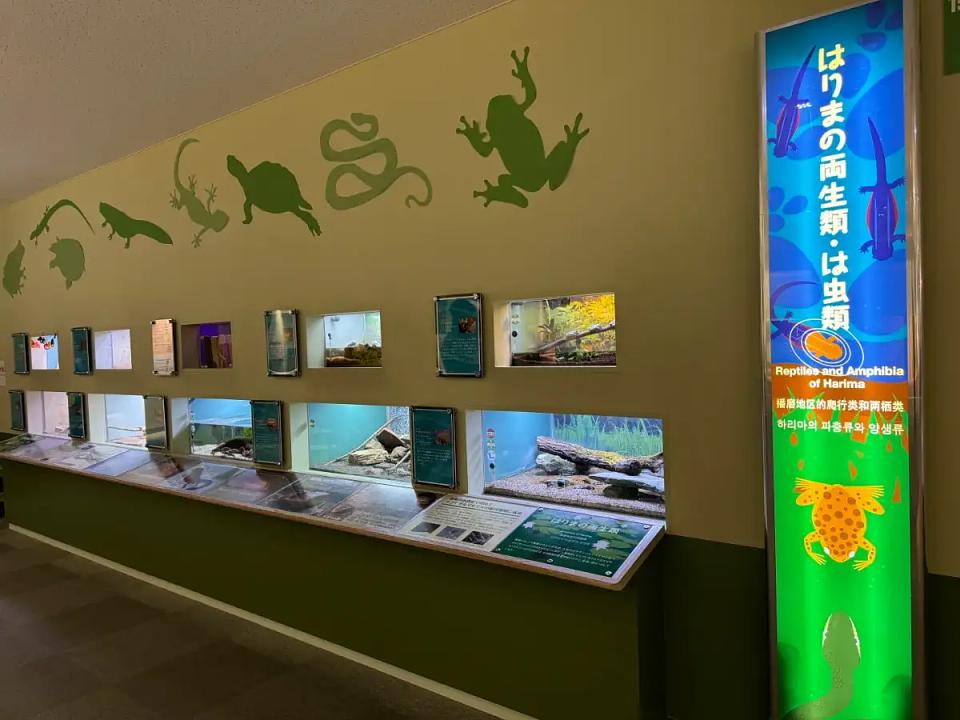 全体的に水槽はお子さんの目線の高さに合わせて設置されているものが多く、小さなお子さんでも楽しめるよう工夫されているのが印象的。小さい水槽は展示替えも比較的安易にしやすく、定期的に水槽を入れ替えることによって、いろいろな種類の生きものに出合えるのも「姫路市立水族館」の魅力のひとつです。全国の水族館で初の繁殖に成功した「ナゴヤダルマガエル」も展示されています。