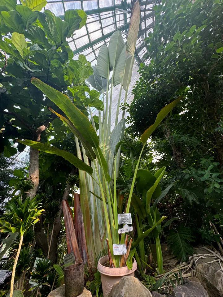 園内には天井に向かって大きく伸びたこんな植物も。扇のように横に葉が広がり育っていくことから「オウギバショウ」と名づけられているそうで、温室内でも一番背の高い植物です。