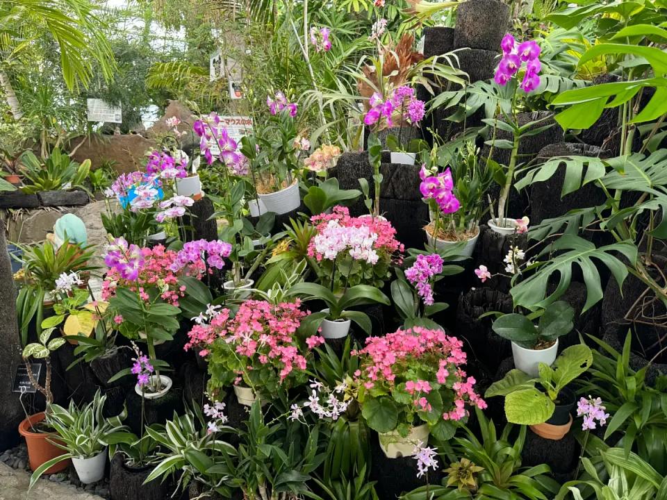 高さ約19mある大温室内には、熱帯や亜熱帯性の植物を中心に展示。鮮やかな花が咲く熱帯花木や、マンゴー、バナナといった熱帯果樹など珍しい植物が見られます。