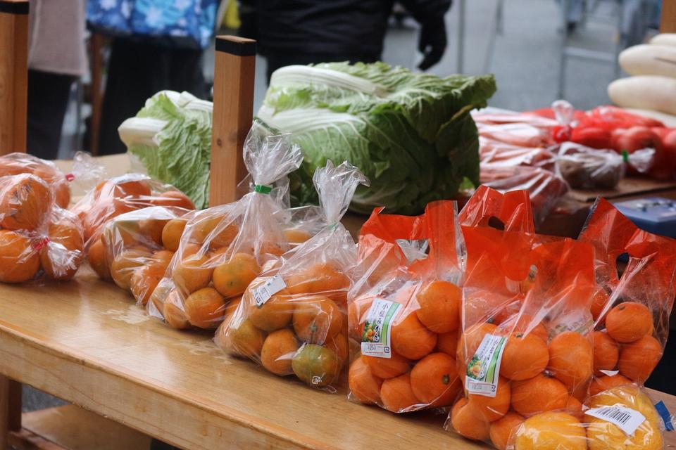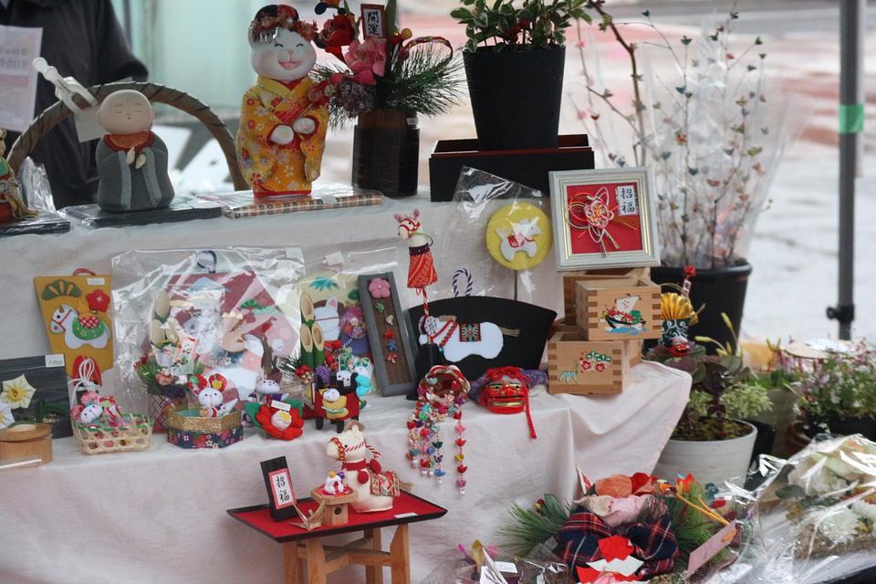 年末年始に向けて、野菜、海産物、フルーツ、お餅、花、お弁当やお菓子、かわいらしいハンドメイド品などが並んでいました。