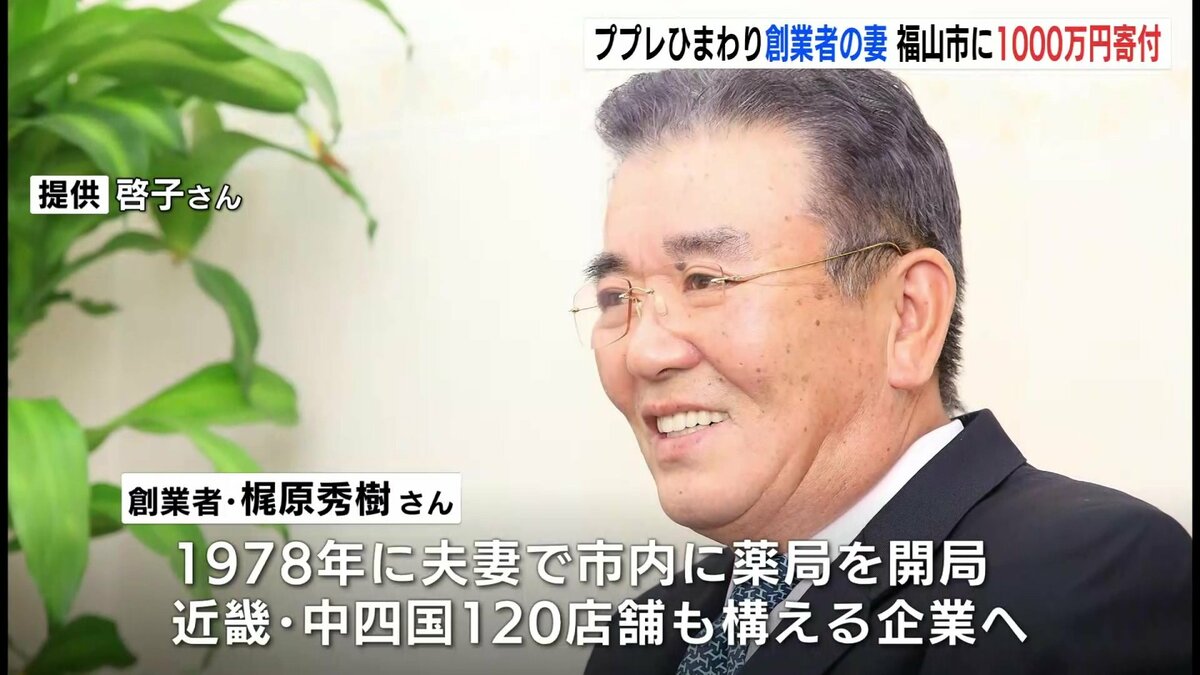 福山市役所を訪れたのは「ププレひまわり」創業者の妻・梶原啓子さんです。夫の梶原秀樹さんは、1978年に啓子さんと福山市内に薬局を開局。近畿や中四国地方にドラッグストアを120店舗も構える企業に成長させましたが、2025年6月、病気のため亡くなりました。