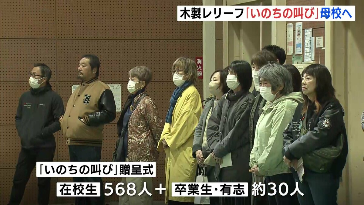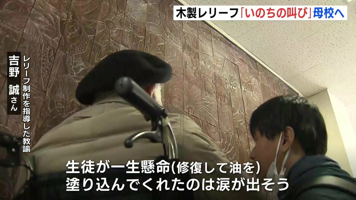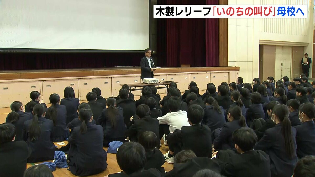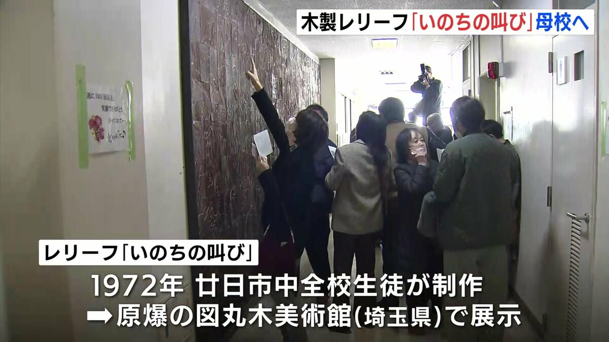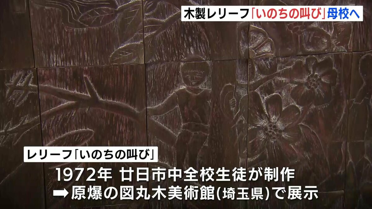半世紀以上前に、広島の中学生たちが作った木製のレリーフが、美術館での役割を終え、母校に里帰りしました。