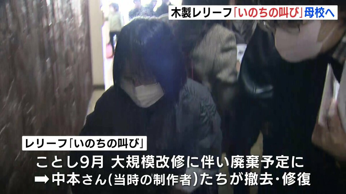 レリーフ「いのちの叫び」は、1972年に当時の全校生徒が制作。その後、埼玉県の原爆の図丸木美術館に寄贈され、今年9月まで展示されていましたが、美術館の大規模改修に伴い、行き場を失いました。そこで、当時制作した中本さんが里帰りを企画し、仲間を募って修復したのです。