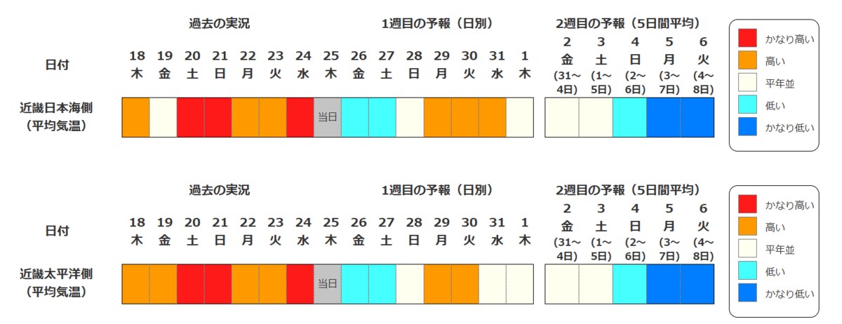近畿地方の気温は、向こう3日間程度は平年並か低いですが、その後は暖かい空気に覆われやすいため、12月31日頃までは高いでしょう。1月3日頃からは強い寒気が流れ込むため、平年並か低く、かなり低くなる可能性があります。また、1月3日頃からは、近畿日本海側では降雪量がかなり多くなる可能性があります。