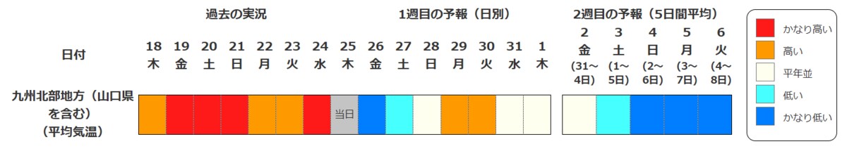 九州北部地方(山口県を含む)の向こう2週間の気温は、12月27日頃までは寒気の影響で低く、かなり低い日もあるでしょう。その後は暖かい空気に覆われやすいため平年並か高いですが、1月2日頃からは冬型の気圧配置が強まり、強い寒気の影響を受けやすいため、かなり低くなる可能性があります。