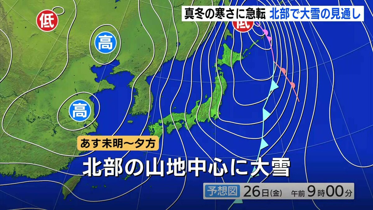 25日の県内は、昼過ぎまで上空に暖かい空気が入っていたため、各地で平年より高い最高気温となりました。ただ、25日夜から26日にかけて強い寒気が流れ込む予想です。26日は、一気に真冬の寒さになるでしょう。冬型の気圧配置が強まり、北部では、26日未明から夕方にかけて山地を中心に大雪となる見通しです。南部でも、雪が積もるところがある見込みです。26日夕方までの24時間に降る雪の量は、いずれも多いところで、北部の山地で40cm、南部の山地で25cmと予想されています。積雪や路面の凍結、農作物の管理には十分ご注意ください。