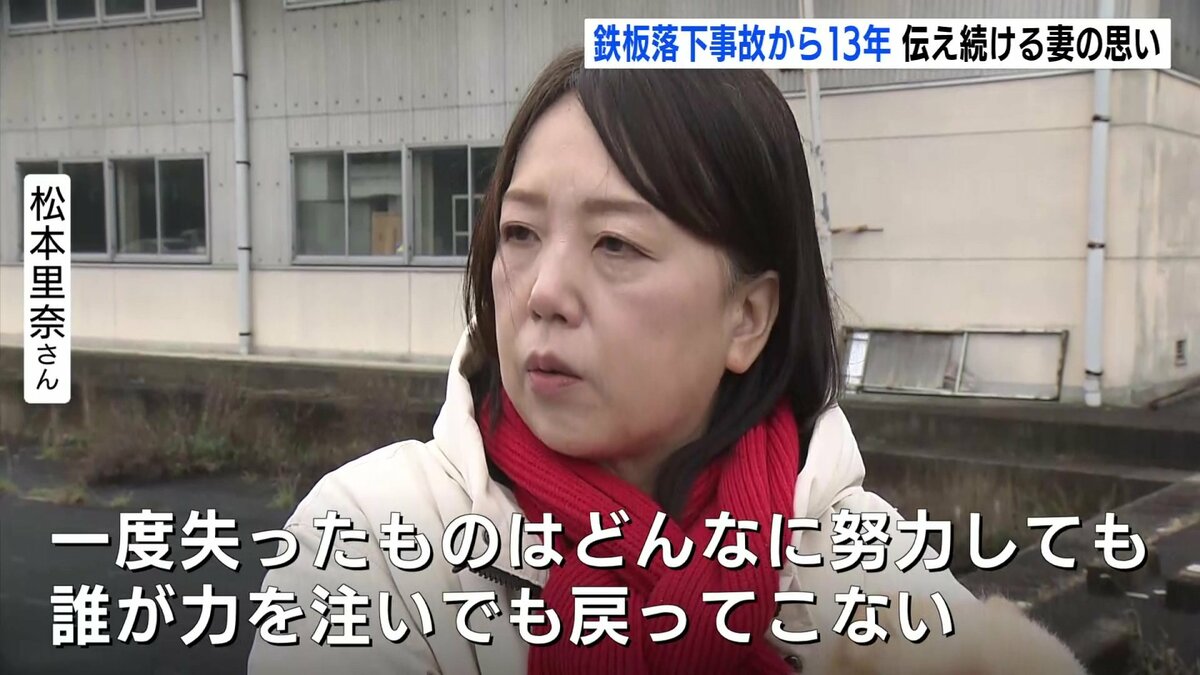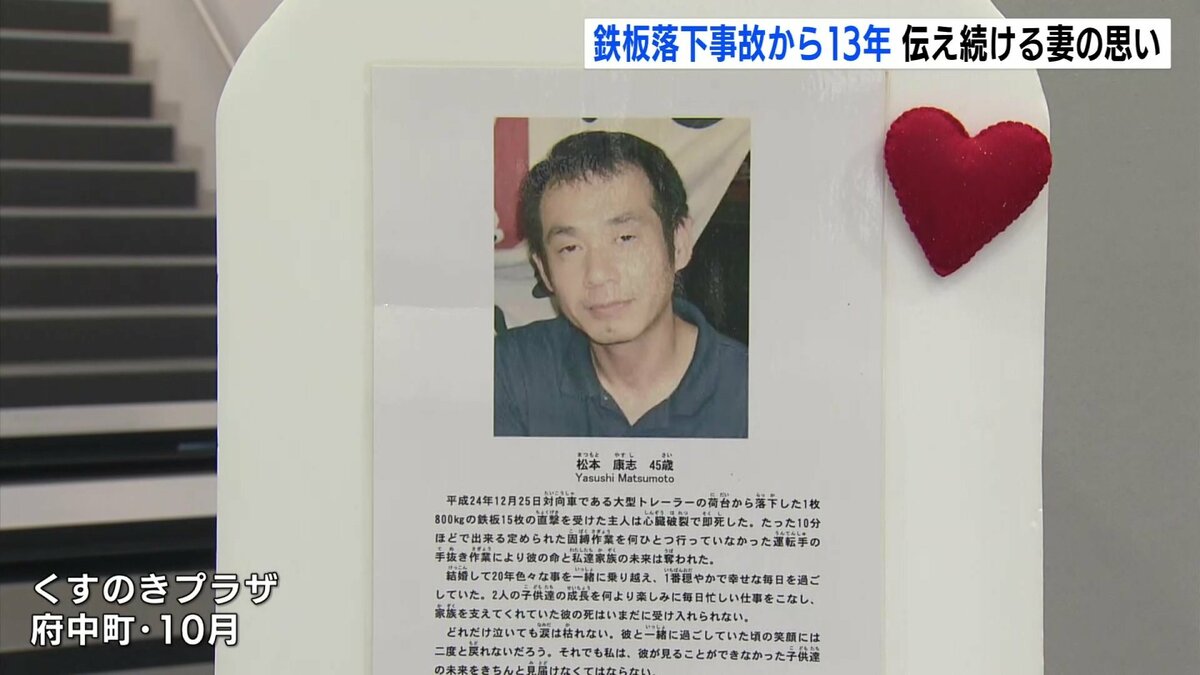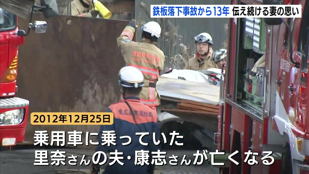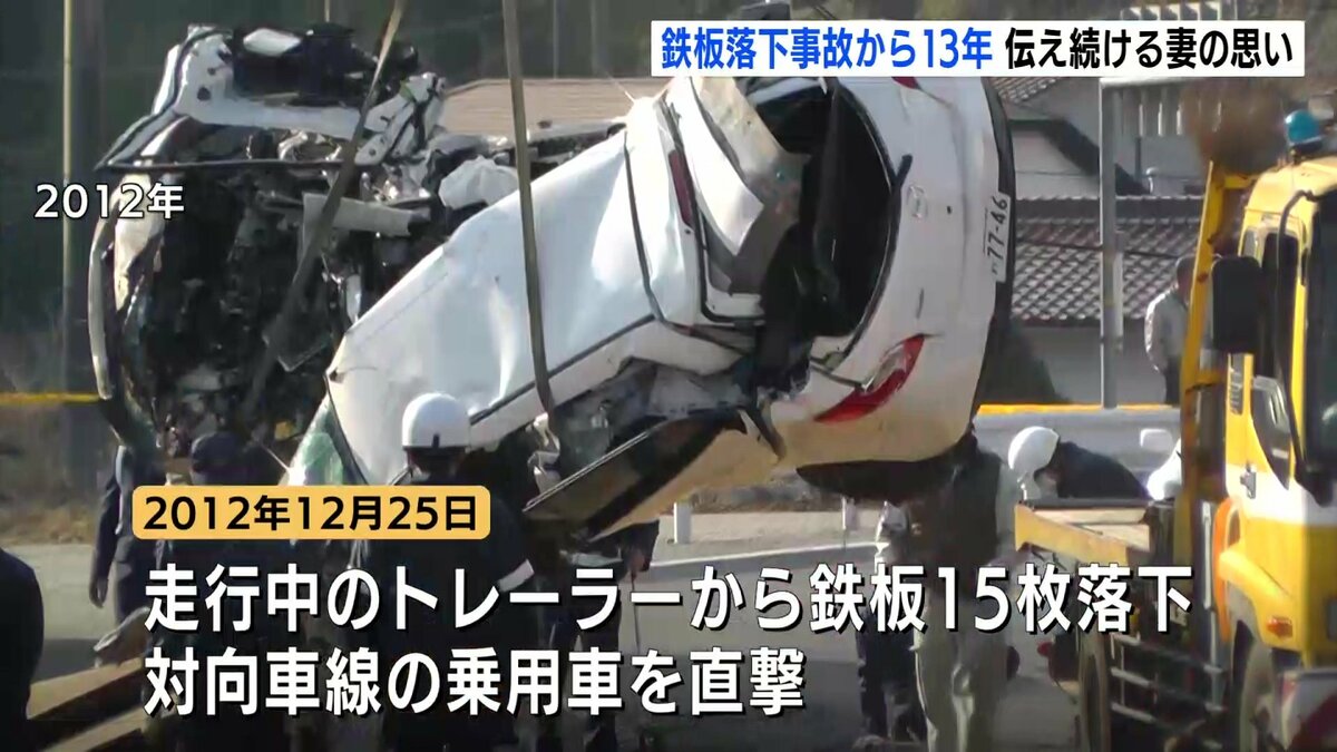 2012年のクリスマスの朝、走行中のトレーラーから1枚800kgの鉄板15枚が落下し、対向車線の乗用車を直撃。この事故で乗用車に乗っていた松本さんの夫・康志さんが亡くなりました。
